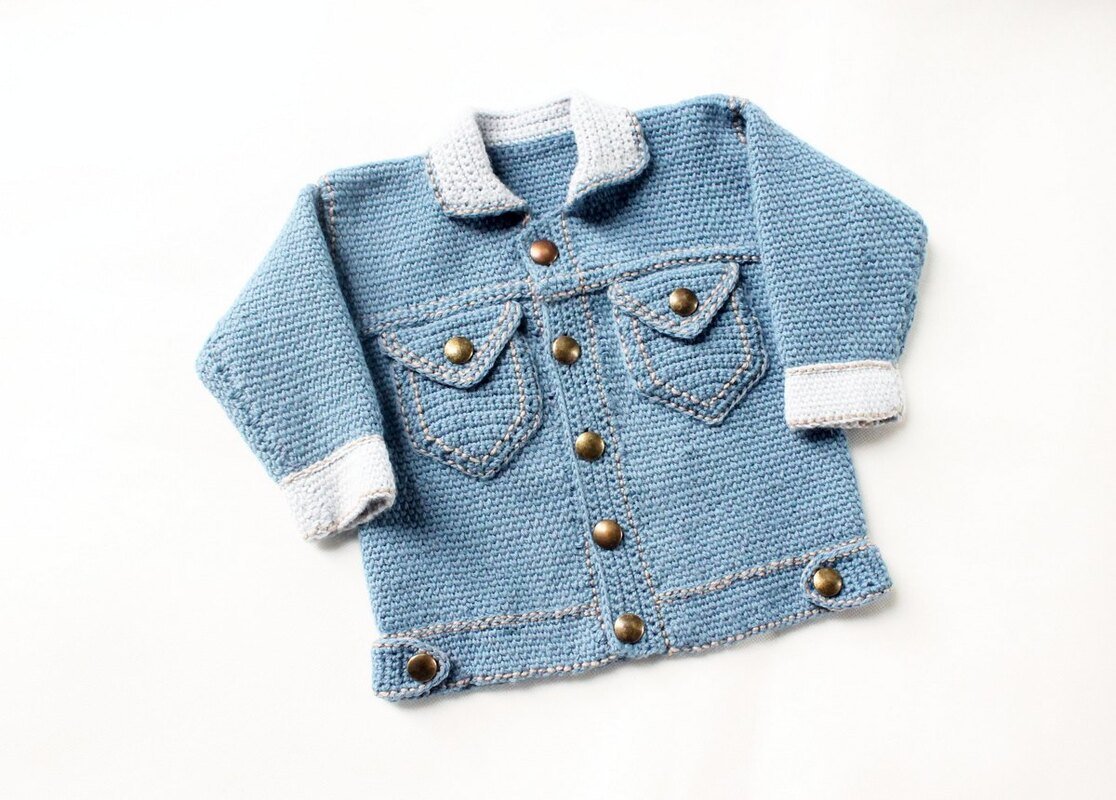 Zwei PDF-Häkelanleitungen bestehend aus bebilderten Anleitungen zum Häkeln von Baby- und Kinderjacke "Jeans" und Baby- und Kinderhose "Jeans", Gr. 50-104.