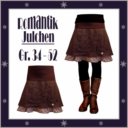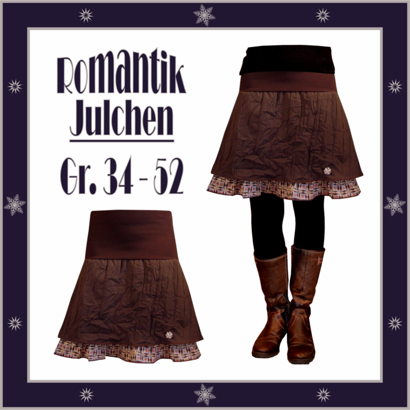 Romantisch verspielter Rock für alle Gelegenheiten mit breitem bequemen Jerseybund. Er wird leicht hüftig getragen und kann auch als Umstandsrock verwendet werden. Die Länge kannst Du problemlos Deinen Wünschen anpassen.