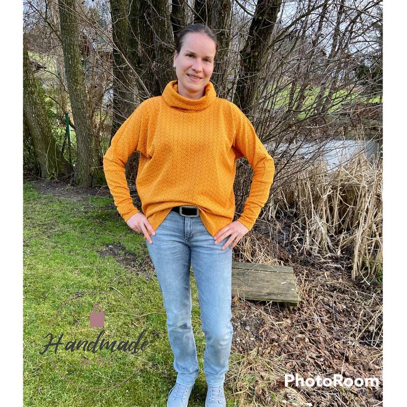 Das BlueCosyShirt ist ein lockerer Pullover mit Kragen. Genäht werden kann es mit 2 verschiedenen Kragenweiten und in 3 Längen. Somit habt ihr die Möglichkeit es auch als Croptop oder Longshirt mit engen Bauchbündchen zu nähen. Die Ärmel werden mit langen Bündchen genäht. Optional könnt ihr eine Knofpleiste an der Ärmelnaht einnähen.