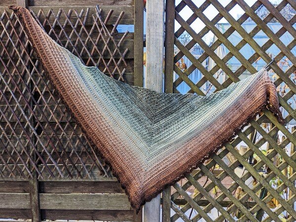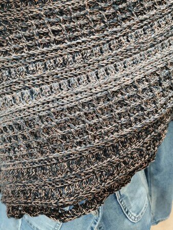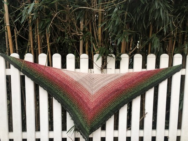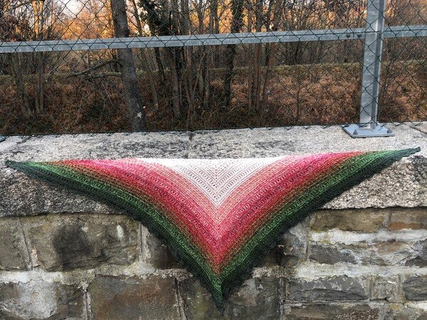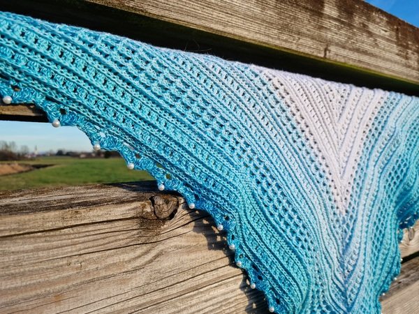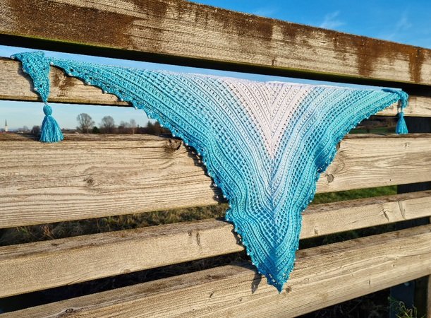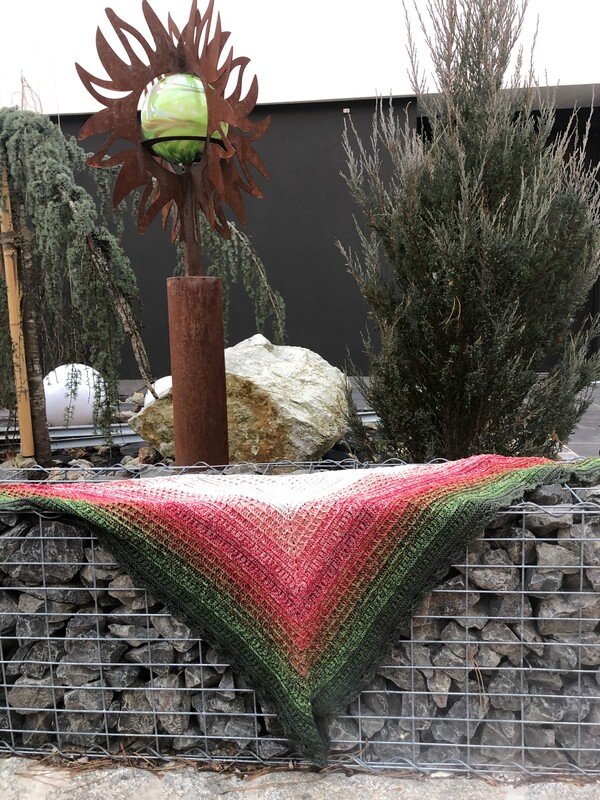 Das Tuch auf der Startseite wurde mit dem Bobbel #312 mit 1250 m, 4-fädig aus der Mützenstraße und Nadelstärke 3,5 angefertigt und misst ca. 175 x 69 cm.