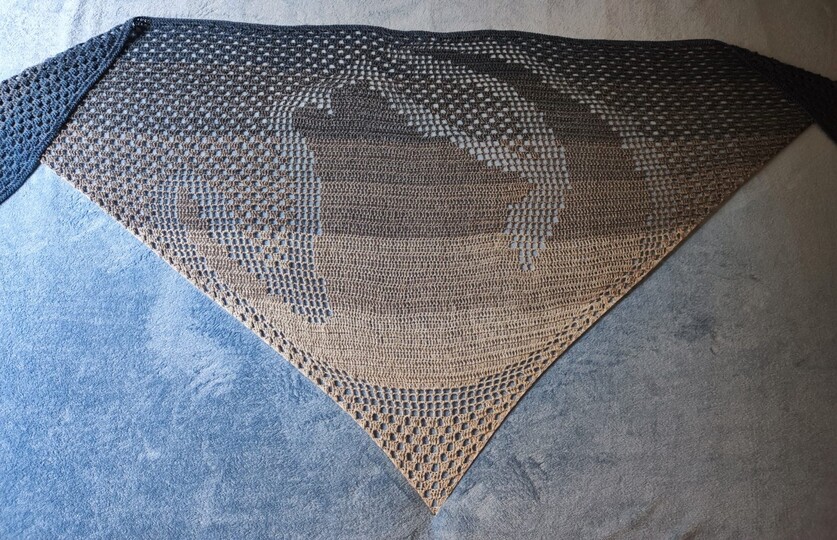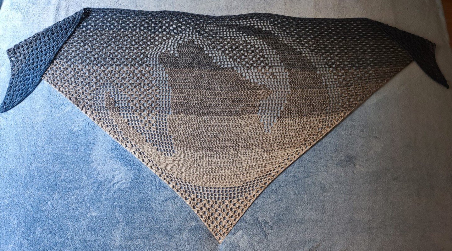 Die Anleitung ist auf 4 Seiten in teilweise Schrift (Erklärung Filethäkeln), der Anfang des Tuches in Pc-Häkelschrift und Zählraster geschrieben.