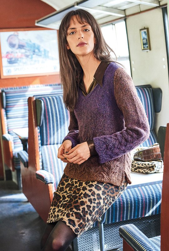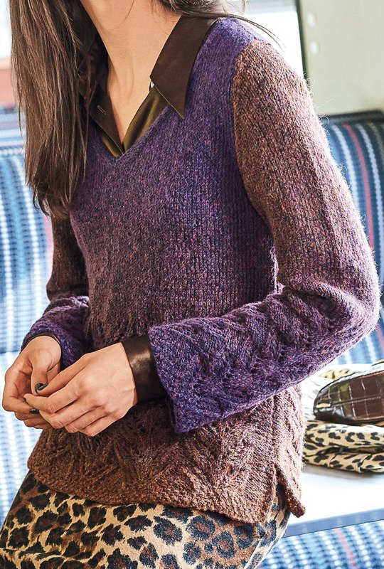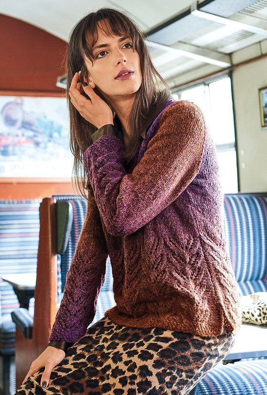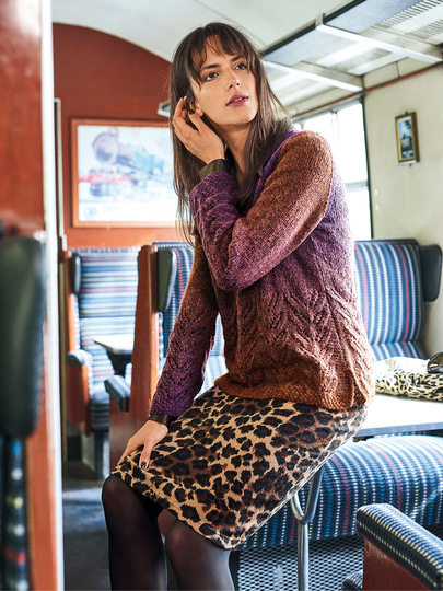 Von Zimt bis Violett: Allein der wunderschöne Farbverlauf macht diese Tunika zum Hingucker. Ajourstrukturen im unteren Bereich, glatt rechts im oberen, Seitenschlitze und V-Ausschnitt komplettieren den modischen Look. Trau dich und kombiniere den zweifarbigen Pulli mit einem Rock mit Animalprint – das sieht aufregend aus. Bund und Ärmelbund sind im Perlmuster gearbeitet, am V-Ausschnitt entlang verläuft ein schmaler Patentrand. Das Garn besteht größtenteils aus Baumwolle, die mit Schurwolle und Alpaka versponnen ist. Die Anleitung dazu gibt es in den Größe 36/38 und 44/46.