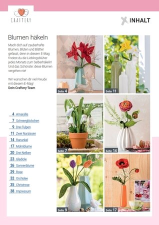 Ob Amaryllis im Januar, Schneeglöckchen im Februar, Tulpen im März, Narzissen im April, Ranunkeln im Mai, Mohnblumen im Juni, Nelken im Juli, Gladiolen im August, Sonnenblumen im September, Rosen im Oktober, Orchideen im November oder Christrosen im Dezember - mit diesem E-Mag sorgen wir das ganze Jahr für Häkelprojekte, die einfach Freude machen.