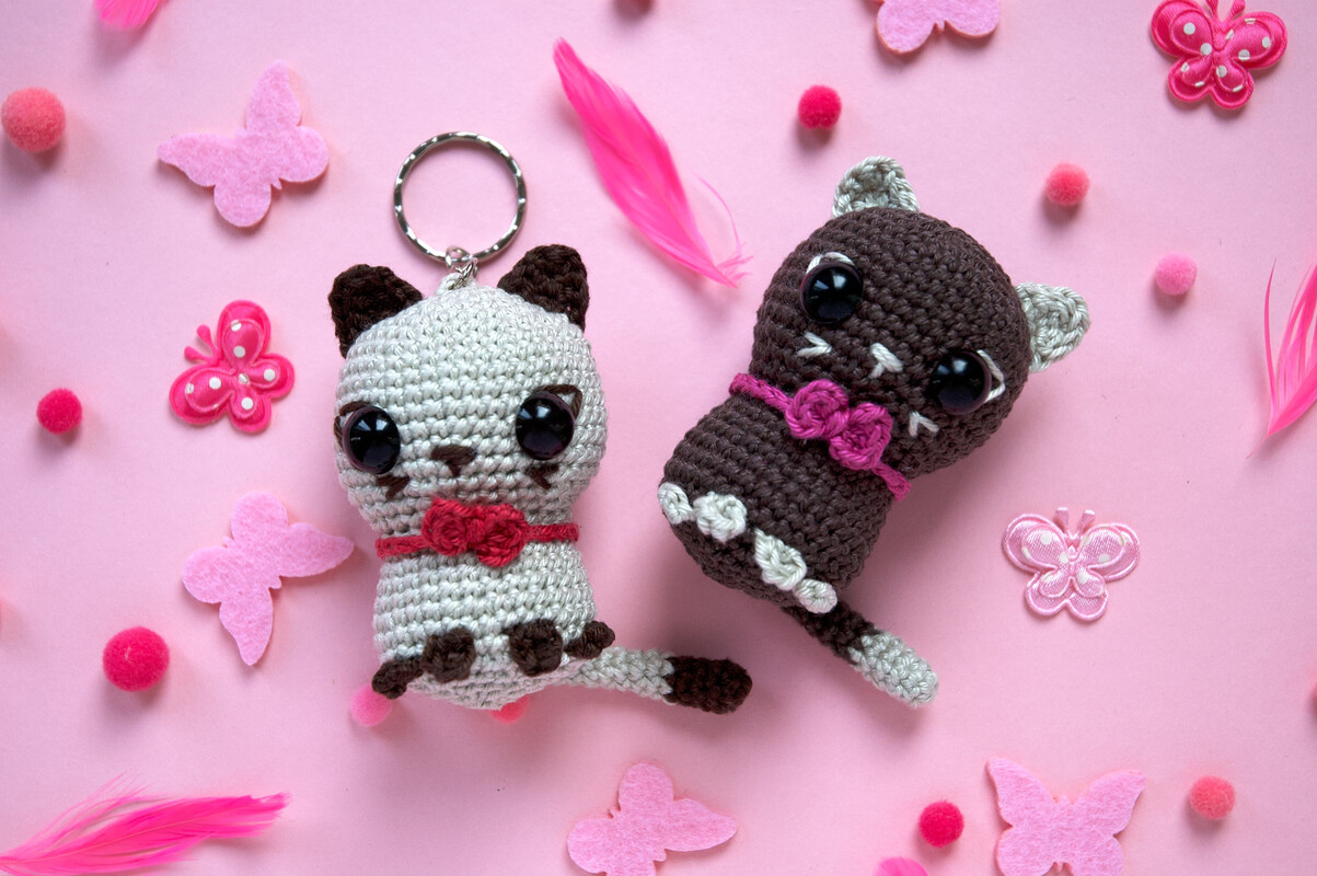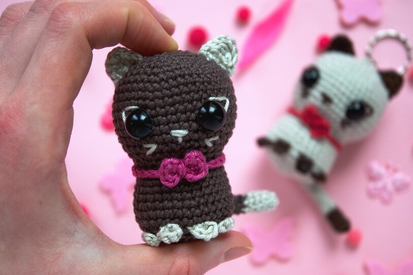 Der Körper und Kopf werden in einem Stück in der Runde gehäkelt. Die Ohren, Pfoten und der Schwanz werden am Ende angenäht.