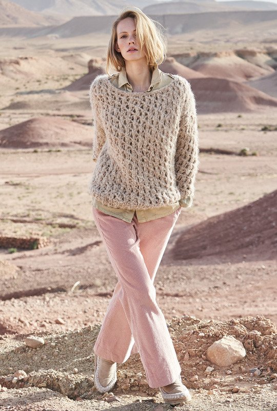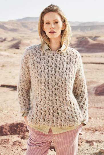Voluminöse Maschen setzen auf lockere Ajourstrukturen. So entsteht auf unvergleichliche Art und Weise der wohlig-weiche Cocooning-Effekt – wie der sandfarbene Sweater aufs Schönste beweist. Das herrliche, moderne Pelzgarn aus feinster Alpaka-Mischung ist weich, leicht und schmeichelt die Haut. Ein einzigartiges Ajourmuster mit kleinem Rapport ist schnell zu erlernen und mit 10er-Nadeln ist der ganze Pulli schnell gestrickt. Die Bündchen werden als 1/1-Rippen gearbeitet. Der runde Halsausschnitt und das löchrige Muster lassen Platz für eine passende Bluse darunter. Die Anleitung ist für die Größen 34/36, 38/40 und 42/44 vorhanden.