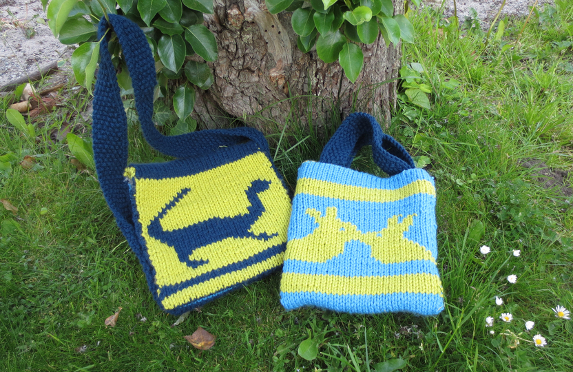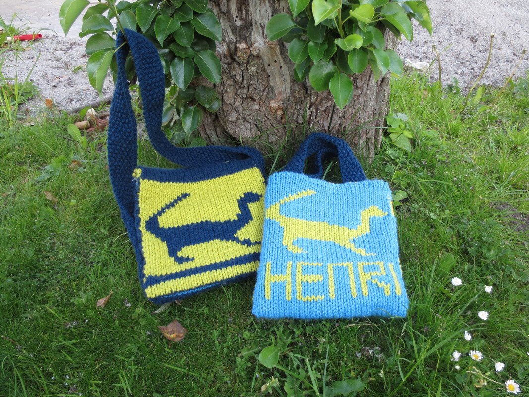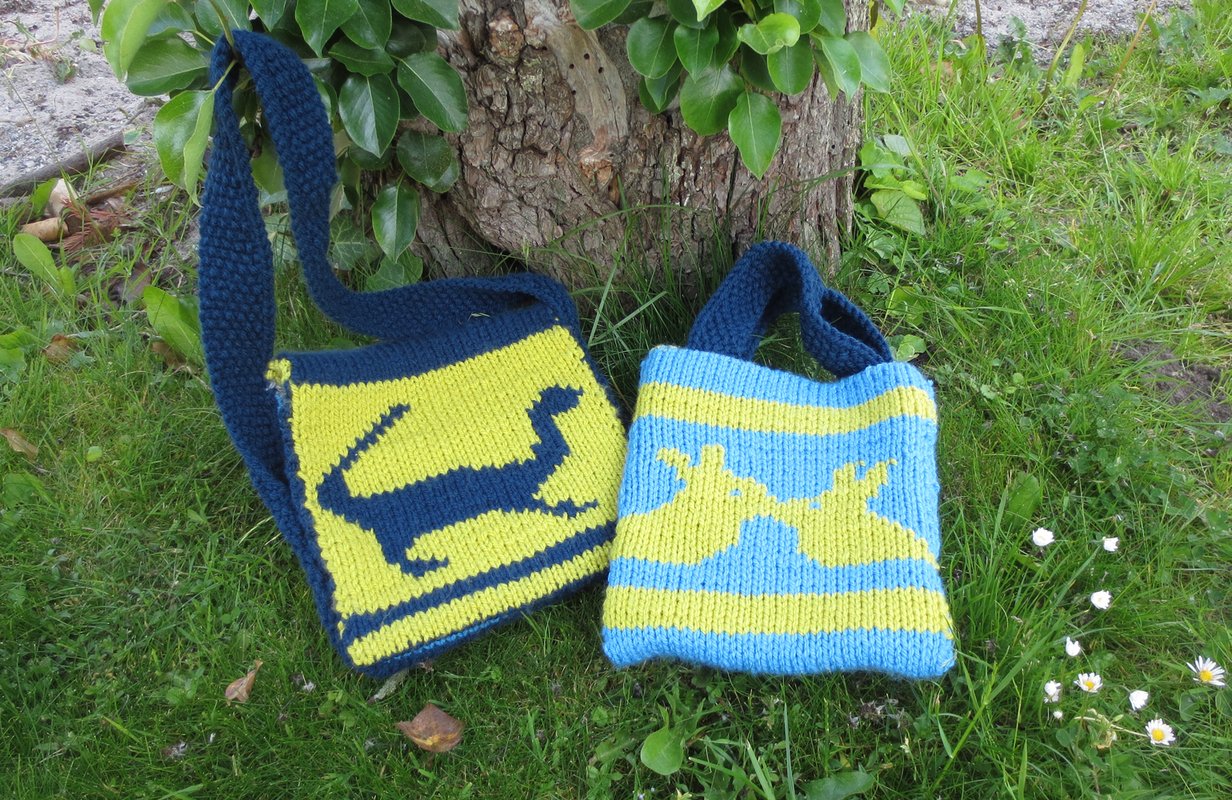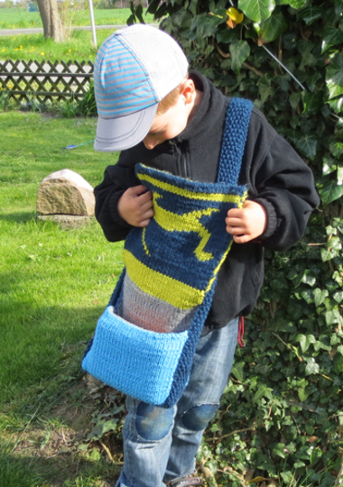 Die Dinosaurier-Umhängetasche ist eher für größere Kinder, mein 5-Jähriger freut sich schon auf den Prototypen. Der Kinderbeutel hat auf der einen Seite den Dinosaurier und auf der anderen zwei süße Häschen. Ich habe ihn für meinen Kleinen gestrickt, er wird gefüllt mit Ersatzsachen für den Kindergarten.