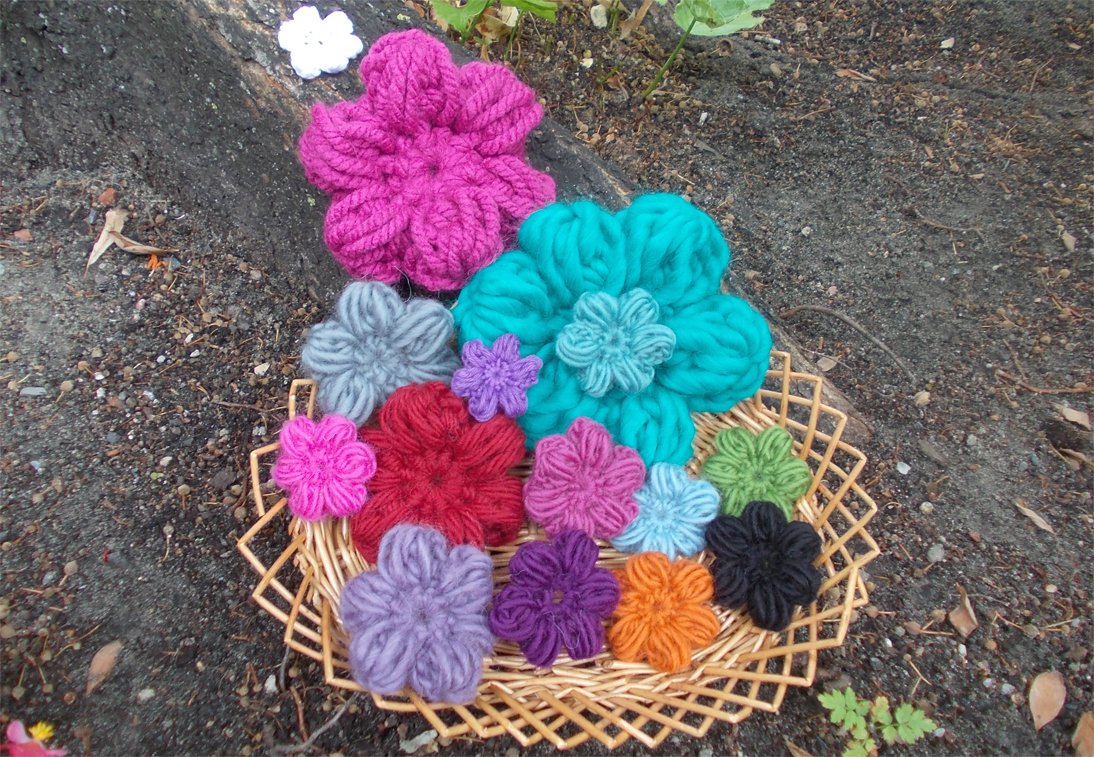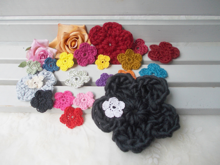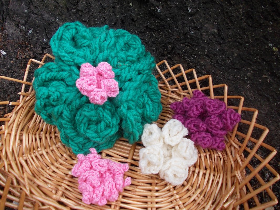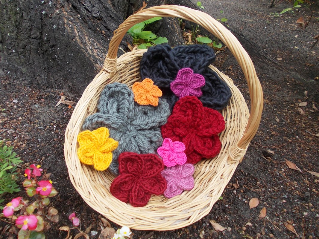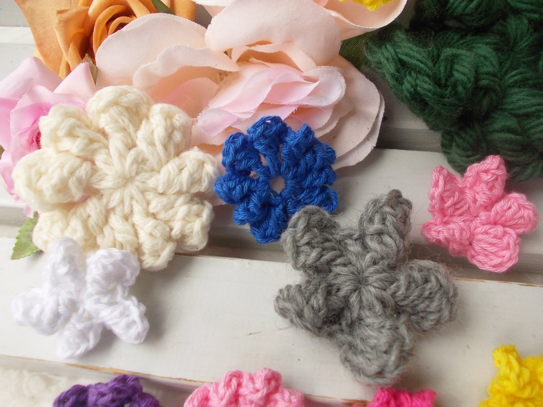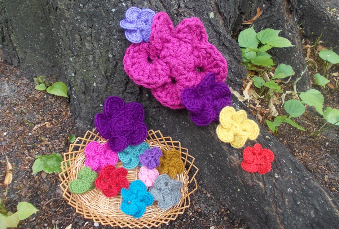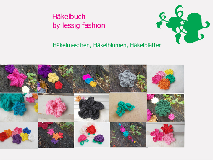 - 15 verschiedene Häkelblumen (Eigenentwürfe, Design by lessig fashion) z. B. Rosen, Flügelblumen, Kristallblumen, Blütenfaltenblumen, Rosenknospenblumen, Pufferblumen) Diese Namen habe ich selbst gewählt, da ich auch die Blumen selbst entwickelt habe.