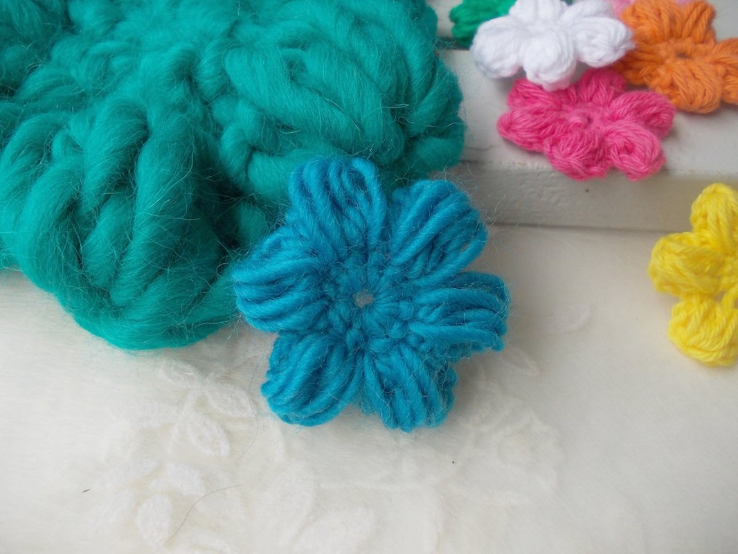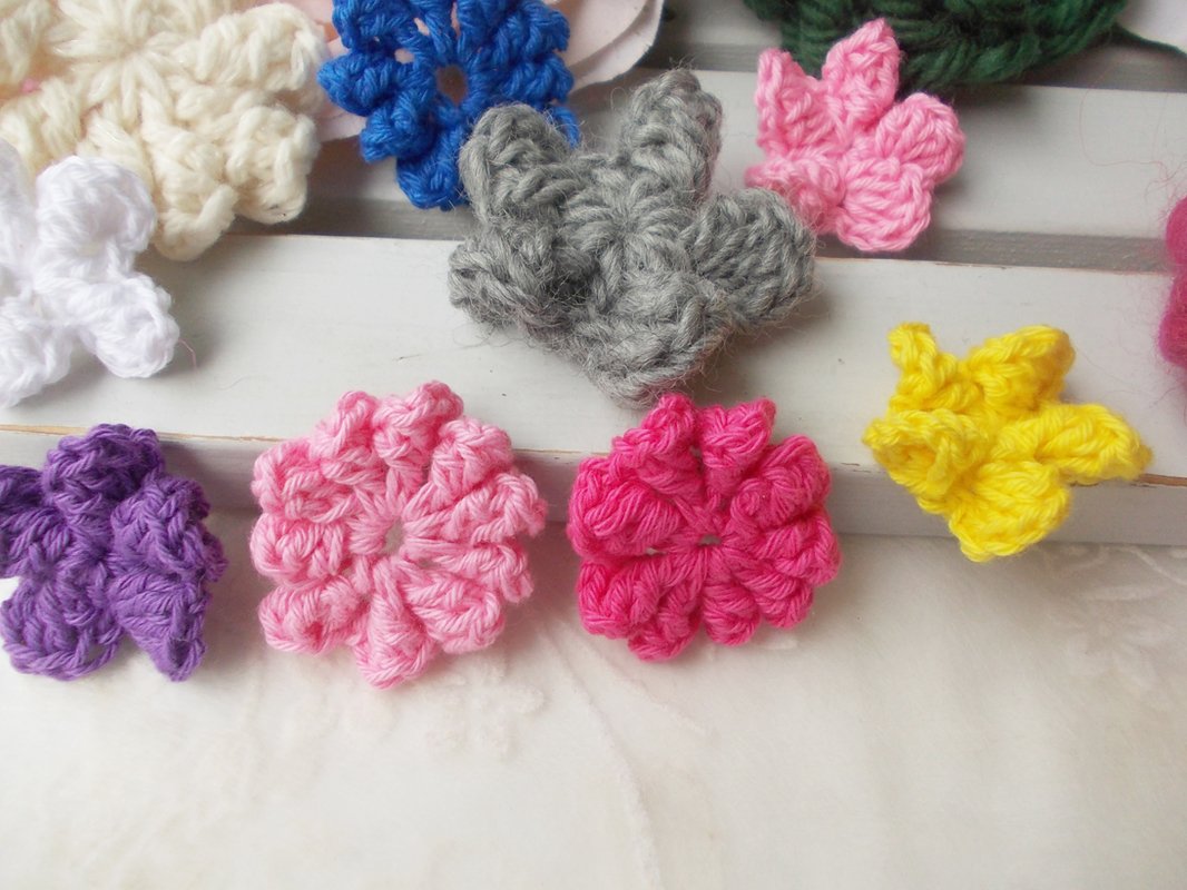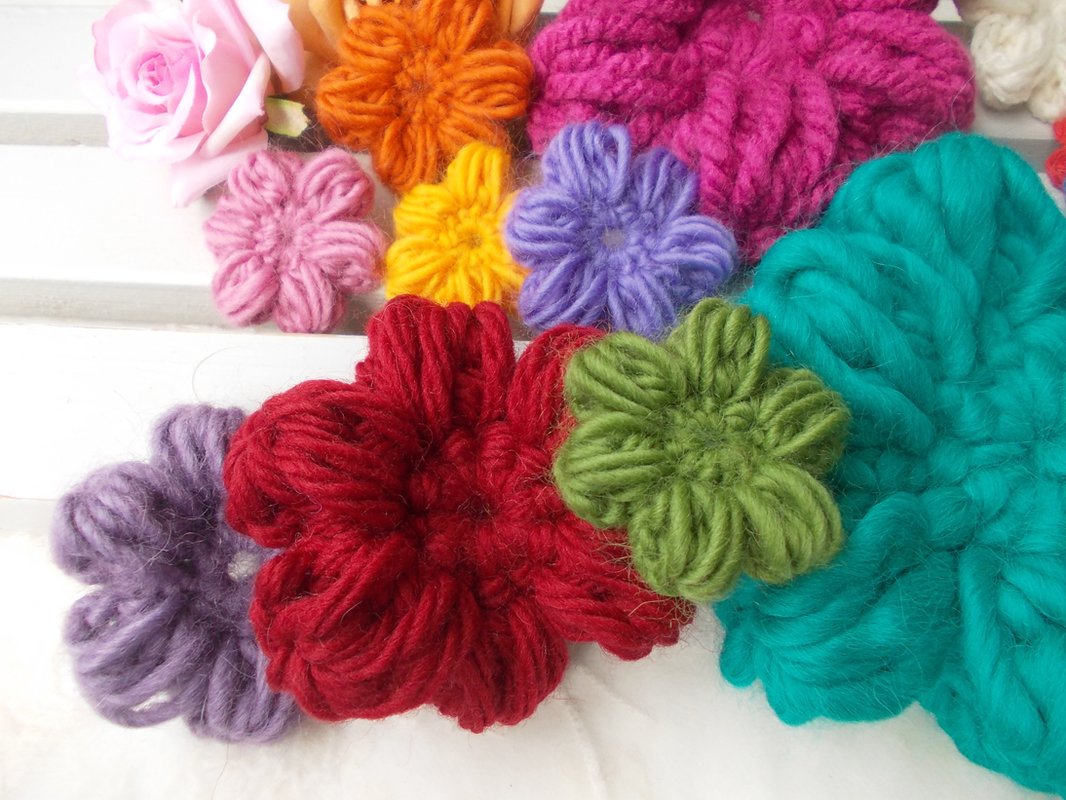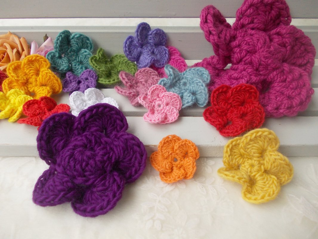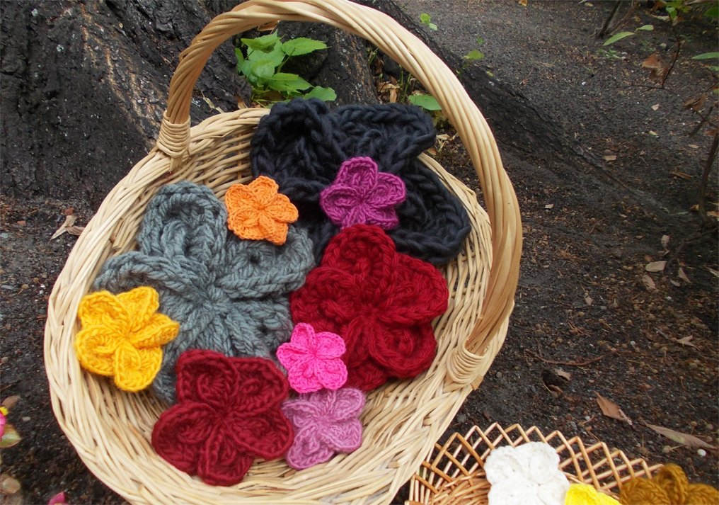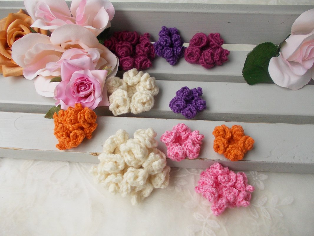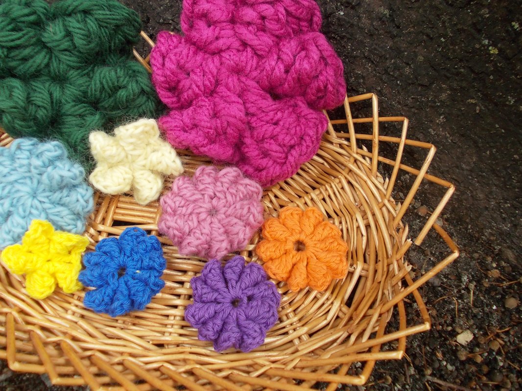 - 15 verschiedene Häkelblumen (Eigenentwürfe, Design by lessig fashion) z. B. Rosen, Flügelblumen, Kristallblumen, Blütenfaltenblumen, Rosenknospenblumen, Pufferblumen) Diese Namen habe ich selbst gewählt, da ich auch die Blumen selbst entwickelt habe.