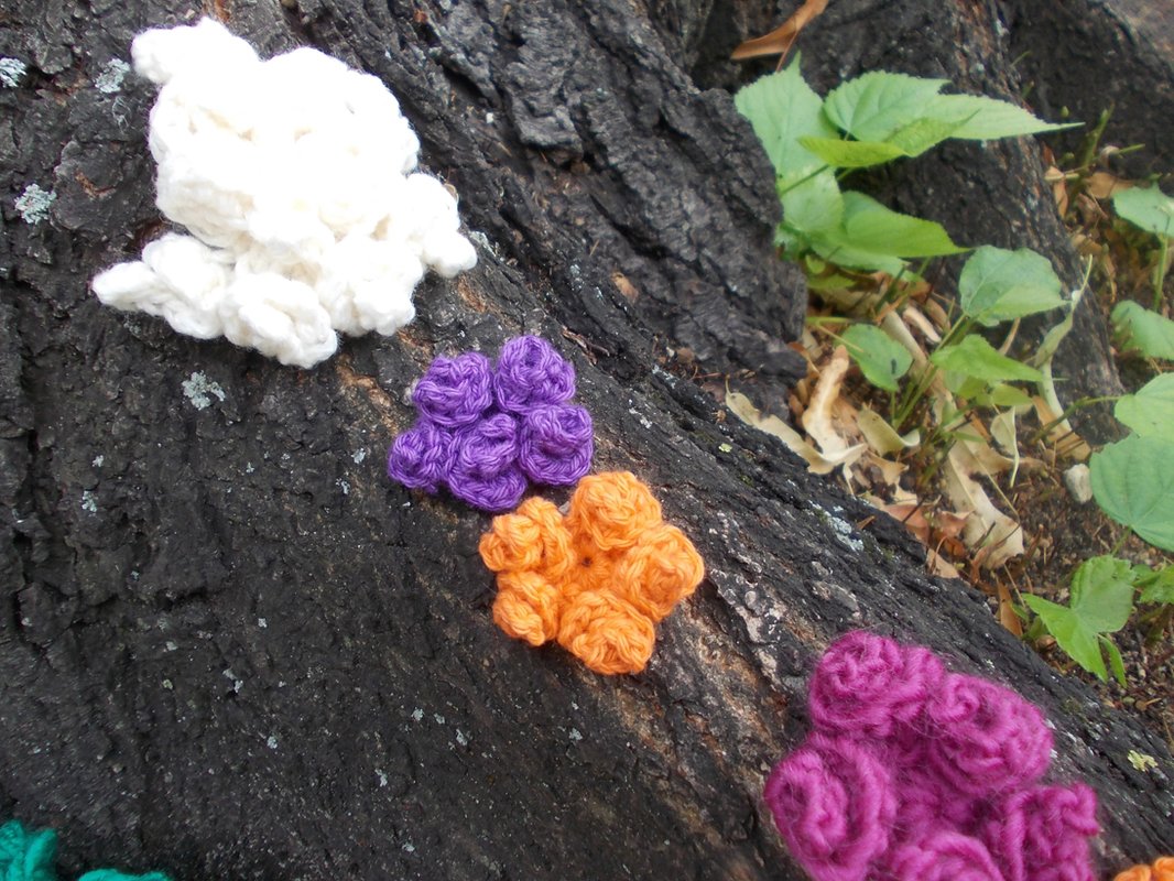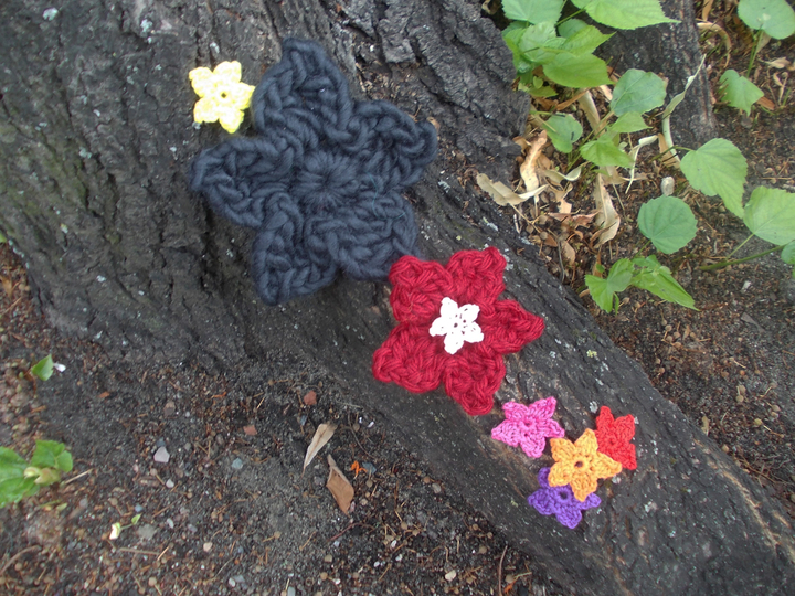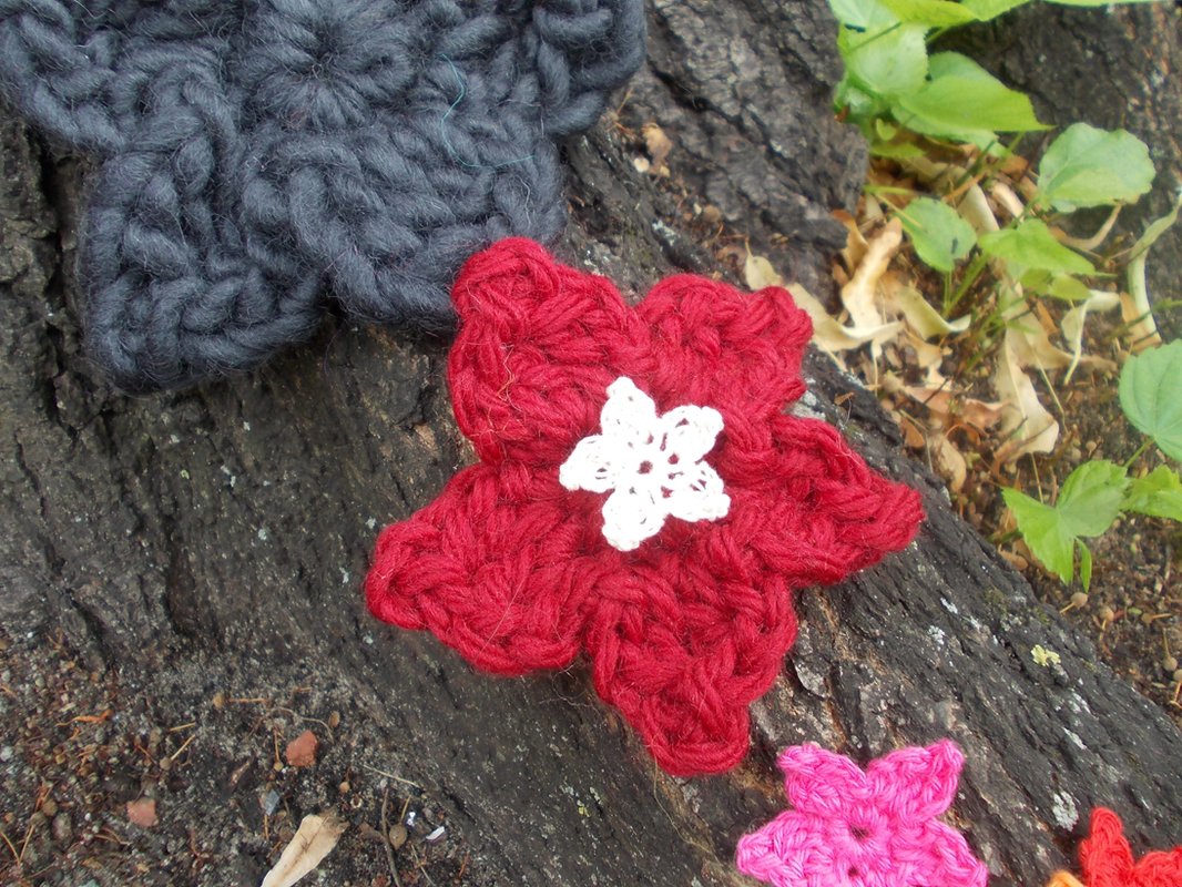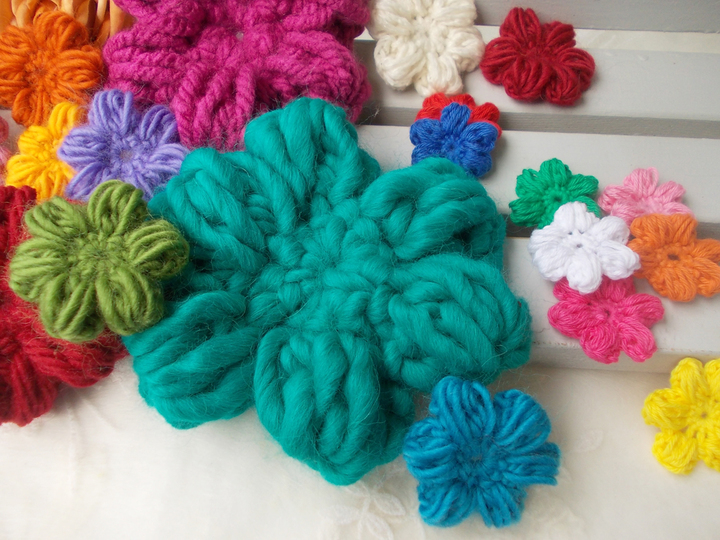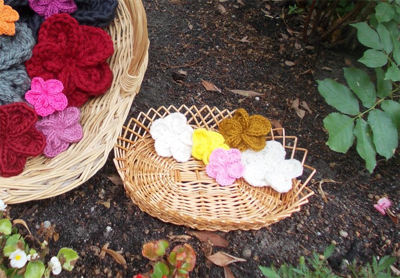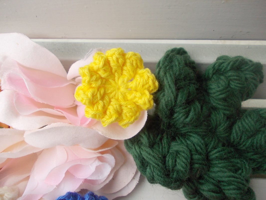 Auf den zahlreichen Bildern sind die Blumen und Blätter in verschiedenen Varianten zu sehen und - wie von mir auch in meinen anderen Anleitungsangeboten erwähnt - gehäkelt aus filigranem Häkelgarn und dicker Wolle.