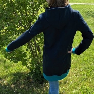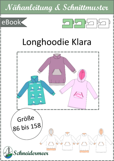 Das Modell „Klara“ ist ein Longhoodie mit Kapuze oder Wickelkragen. Der Hoodie lässt sich als Longhoodie bis zur Mitte des Oberschenkels oder als knieumspielendes Sweatkleid nähen. Außerdem kannst du eine Kängurutasche auf das Vorderteil aufnähen.