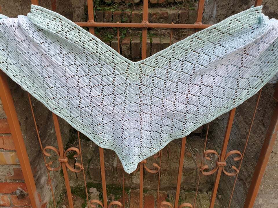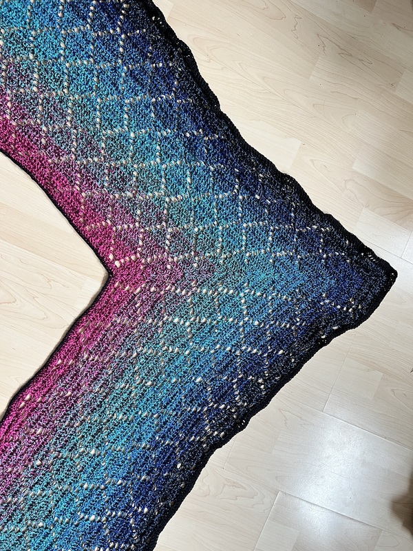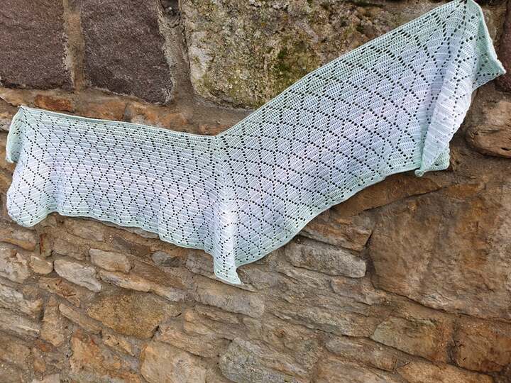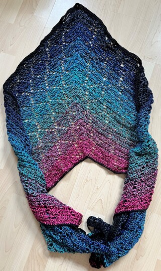 Die Größe ist absolut variabel, von Kinderschal bis XXXXXL Kuschelstola (Fastdecke ;-)) alles ist möglich, bei genug Geduld und Wollvorrat, da das Muster unendlich wiederholt werden kann.
