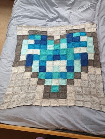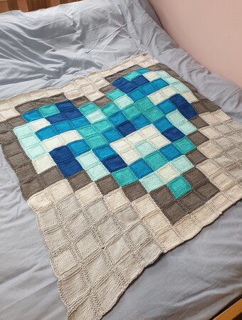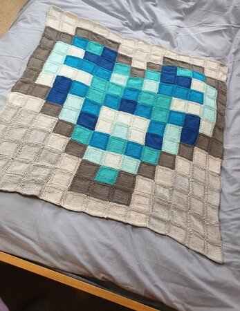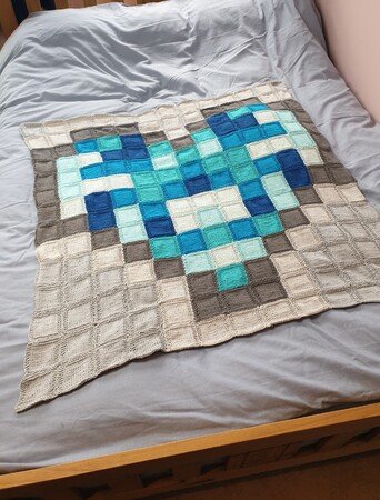 Dies ist eine Anleitung für eine Pixel Herzdecke, gearbeitet in 182 kleinen Quadraten und dann zusammengenäht. Das Herzmuster kann entweder alles in einer Farbe gearbeitet werden oder verschieden töne derselben Farbe so wie ich es gemacht habe, das gleiche gilt für den grauen teil, es kann entweder alles in einem grau ton oder in verschiedenen grau tönen gearbeitet werden.