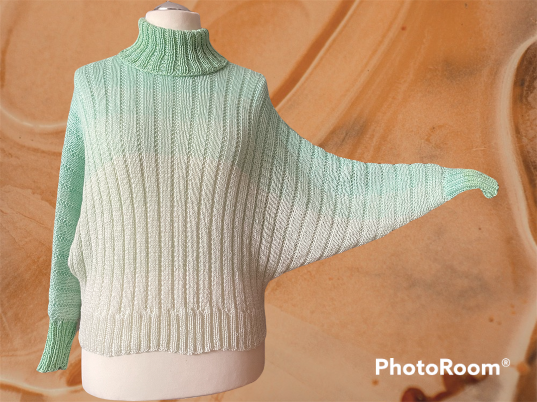 Der Fledermauspullover "Bohal" ist ein besonders schönes Strickstück, das durch seine besondere Konstruktion und seine Farbgestaltung besticht. Dieser Pullover wird mit zwei identischen Wollknäueln gestrickt, was dazu führt, dass der Farbverlauf auf der Vorder- und Rückseite des Pullovers gleich ist. Das bedeutet, dass die Farbmuster und Übergänge auf beiden Seiten des Pullovers symmetrisch und harmonisch aussehen.