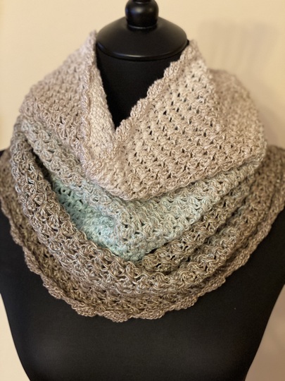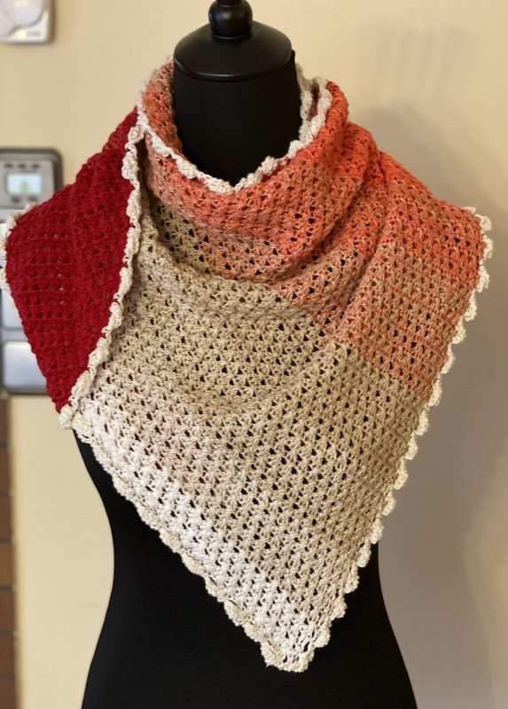 Die Tuch-Varianten, die in den Produktbildern zu sehen sind, sind aus Farbverlaufsgarnen und Häkelnadeln in 3,0 und 6,0, mit folgenden Angaben, entstanden: