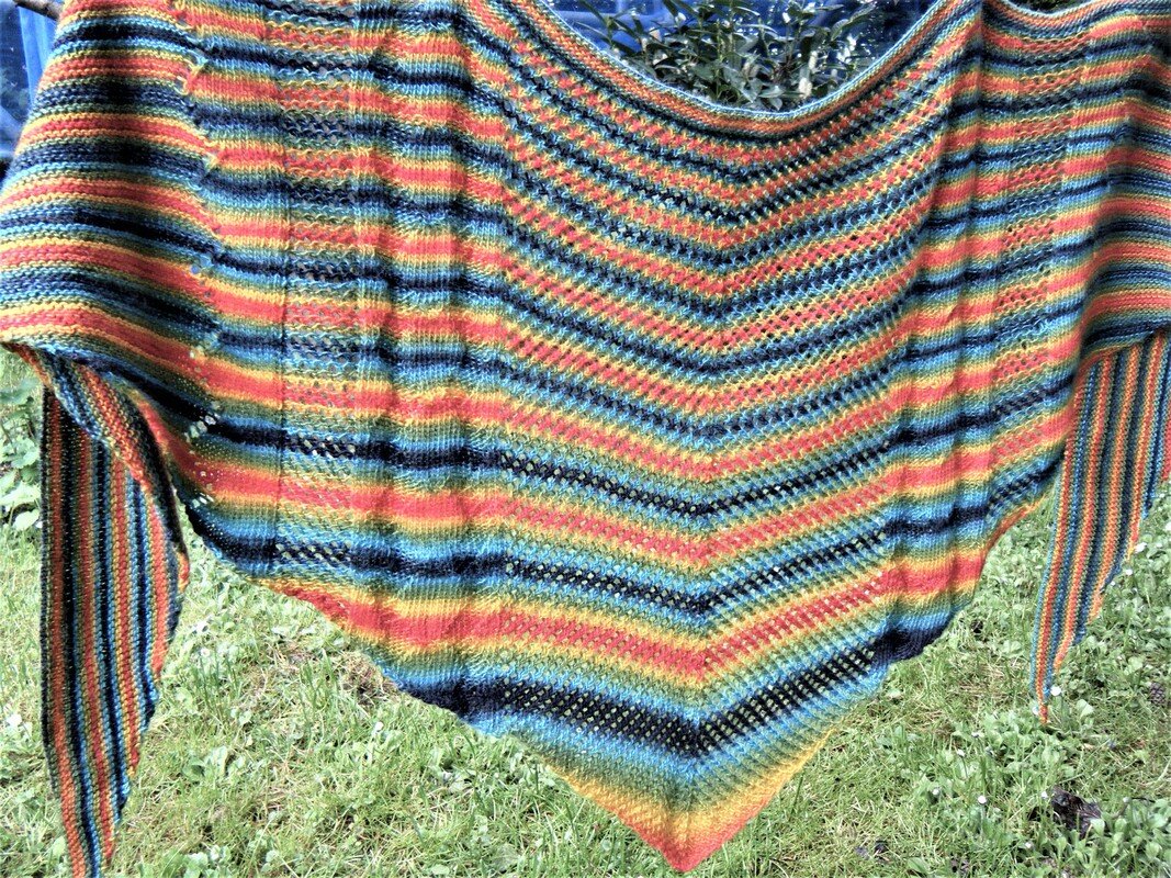 Für das bunte Tuch habe ich ca. 800m „Dream-Lace“ Farbe 180 von PRO LANA 75%