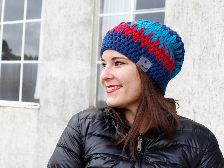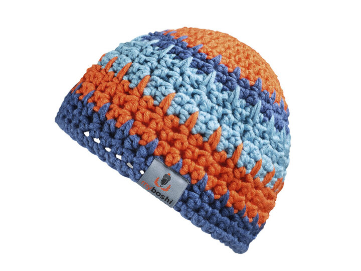Die Mütze Shiga überzeugt mit ihrem bunten Streifenlook, der durch kleine Zähne aus tiefergestochenen Maschen aufgelockert wird. Die Mütze ist eine schöne Herausforderung für erfahrene Häkler*Innen und hält den Kopf im Winter schön warm.