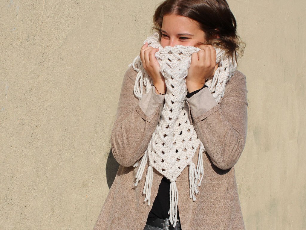Das Dreieckstuch Ayabe hat eine elegante Optik und gibt durch das außergewöhnliche Muster Wärme während es trotzdem luftdurchlässig ist.