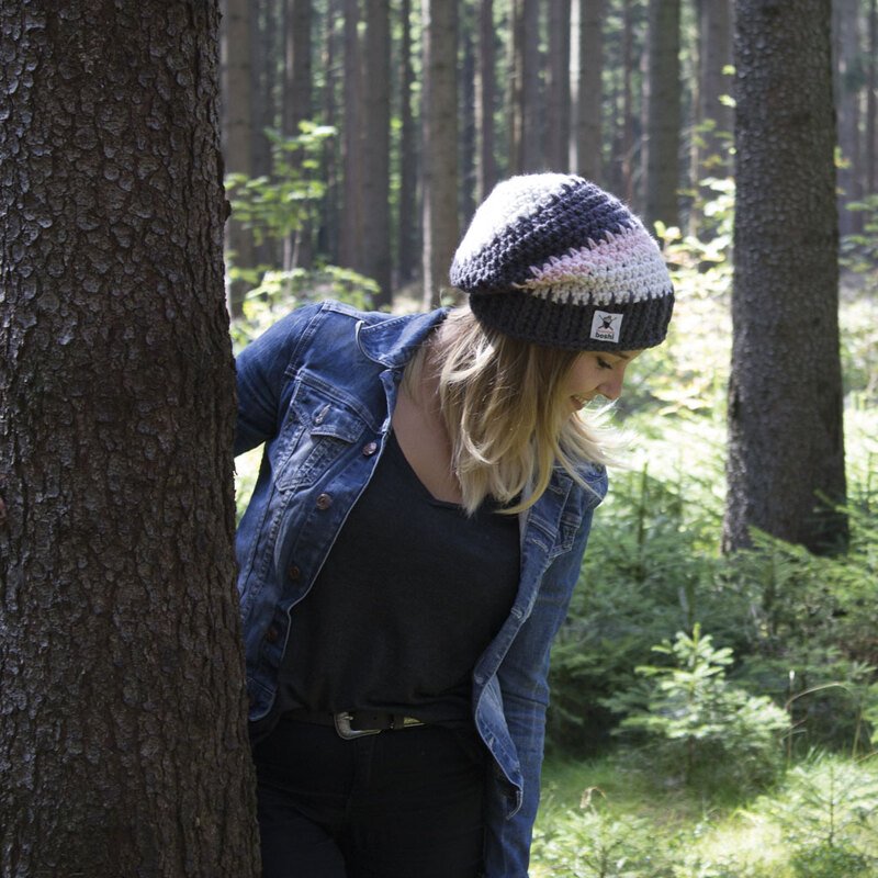 Die Mütze Obihiro wird in Streifen gehäkelt. Der Übergang der Streifen wird durch tiefergestochene Maschen aufgelockert und bekommt eine Sägezahn-Optik.