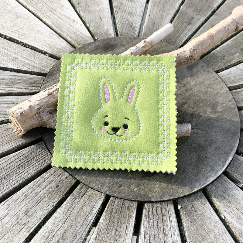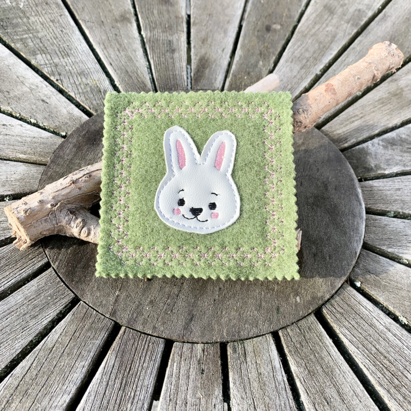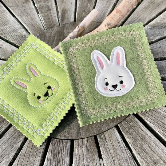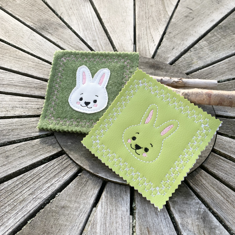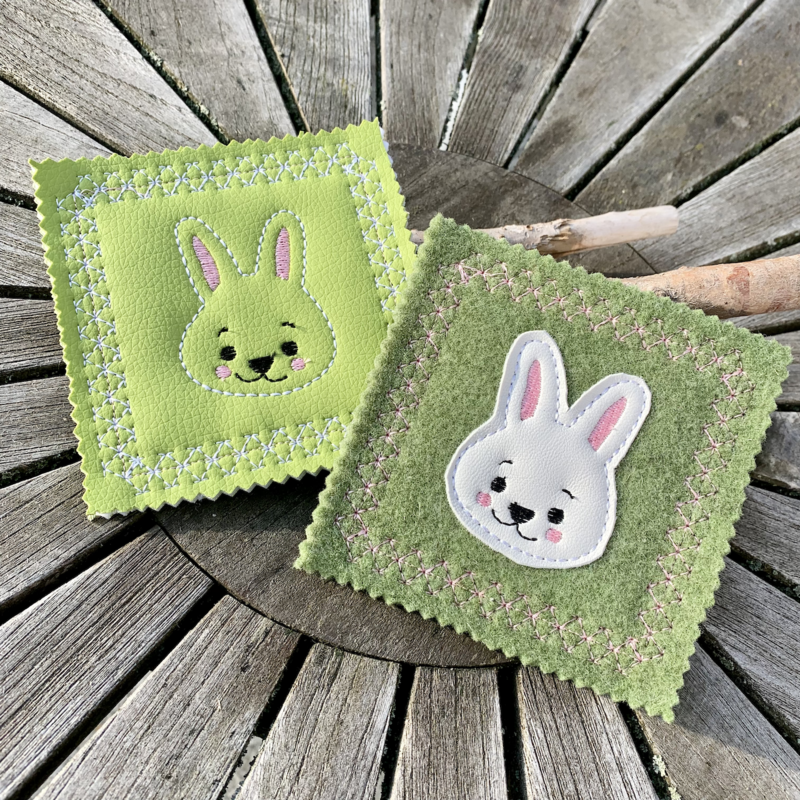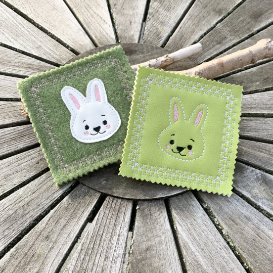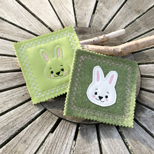 Es sind 2 verschiedene MugRug-Varianten dabei. 1x nur mit einer Hasen-Umrandung und 1x mit einer Hasen-Applikation.