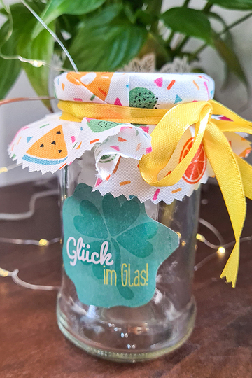 Ein leeres, sauberes Glas ... von Gurken oder Nutella ... Hauptsache wiederverschließbar! Stoffreste, Borten und (Gummi-) Bänder zum Verschönern des Glases.
