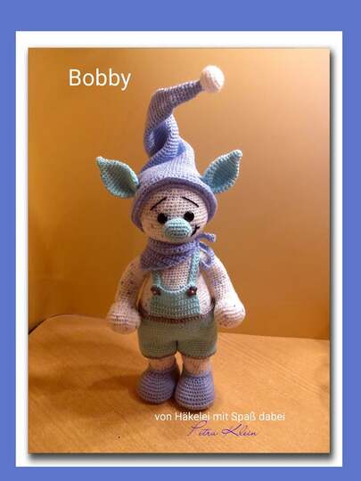 Ich habe Bobby mit Woll Butt Versailles und einer Nadelstärke von 2,0 gehäkelt und er hat bei mir eine Größe von ca. 40 cm.