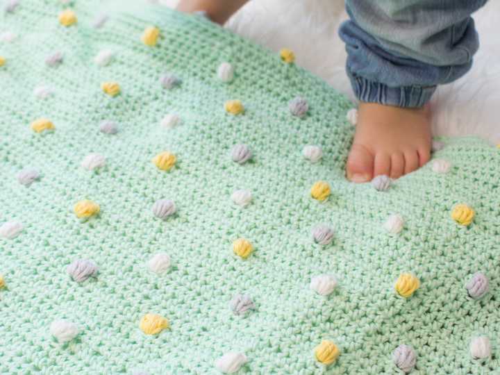 Diese gehäkelte Babydecke ist der Hit mit ihren bunten Knubbeln. Die "Pünktchen" zieren die einfarbige Babydecke und sind trotzdem angenehm für das Baby, wenn es darauf liegt! Mit unserer Häkelanleitung kannst du diese Babydecke immer zu einem Unikat machen, indem du sie in deinen Wunschfarben anfertigst. So kannst du die Knubbel entweder – wie in unserem Beispiel – in 3 verschiedenen Farben ein häkeln. Oder aber du machst alle "Pünktchen" in einer Farbe oder eben jedes in einer anderen Wollfarbe – dadurch wird die Babydecke kunterbunt und wunderbar farbenfroh.