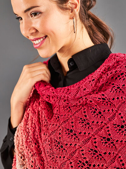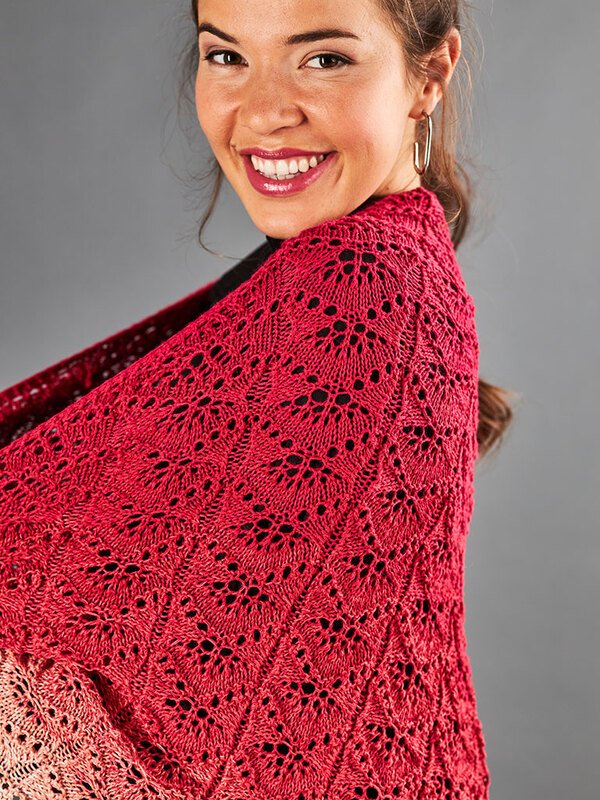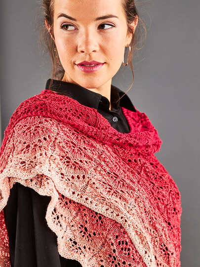 Der Farbverlauf ist von einem hellen rosa in sanften Abstufungen hin bis zu einem leuchtenden rot. Dazu kommt dieses himmlische Muster. Das Tuch wird von der Mitte aus gestickt und durch gut positionierte Zu- und Abnahmen verläuft die Lochmusterreihe in einer schönen Welle.