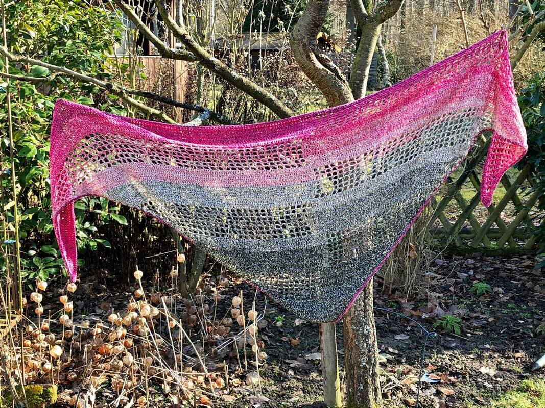 Mein Beispieltuch, gehäkelt mit 850m und NS 4, hat eine Spannweite von 1,95m erreicht.