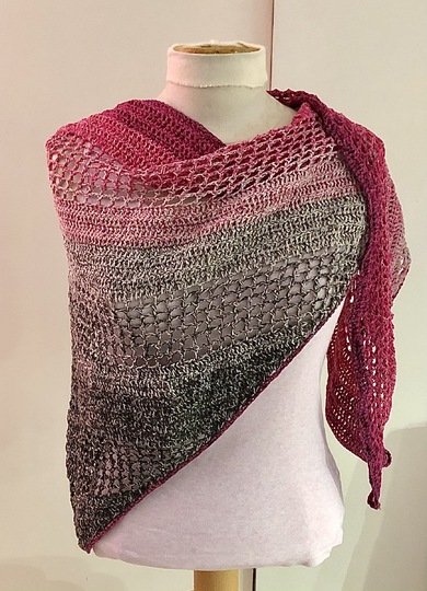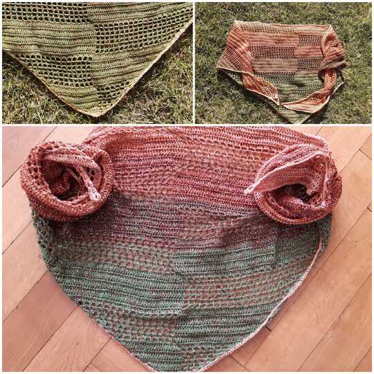 Momo ist ein schlichtes Dreieckstuch, dass von der Spitze aus gehäkelt wird. Es besteht aus einem Musterblock der alle paar Reihen die Seiten wechselt, so dass das Netzmuster immer abwechselnd das Tuch durchbricht. Das Muster ist absolut eingängig, anfängertauglich und 100% fernsehtauglich.