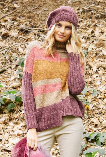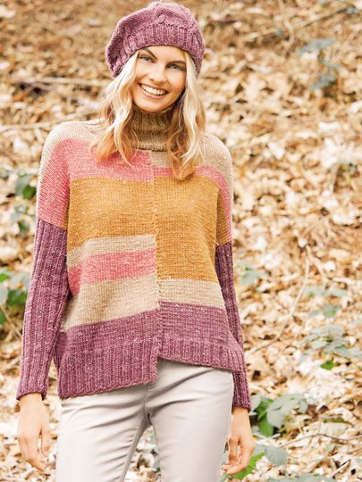 Zum gestreiften Oversize-Pulli die passende Baskenmütze – eine tolle Kombination, die bei Minusgraden nicht nur schön warm hält, sondern die mit ihrer harmonischen Farbigkeit auch bewundernde Blicke auf sich zieht. Das Besondere beim Garn: weiche Schurwolle versponnen mit glattem Hanf in warmen verwaschenen Farben. In Rippen gestrickte schmale Ärmel und Rollkragen sowie der unterschiedlich lange Bund ergänzen die individuelle Form des ansonsten glatt rechts gestrickten Pullovers. Vorder- und Rückenteil sind jeweils in zwei Teilen gestrickt. Den Pulli kannst du für Größe 38/40, 42/44 und auch 46/48 stricken.
