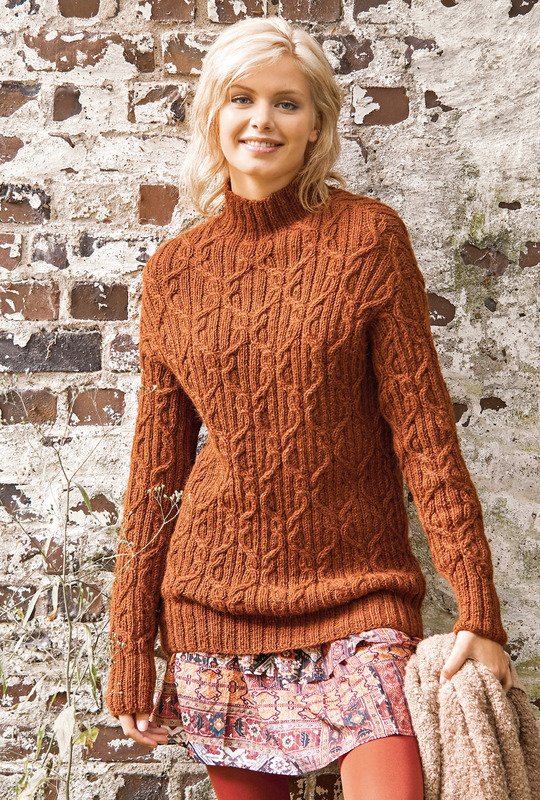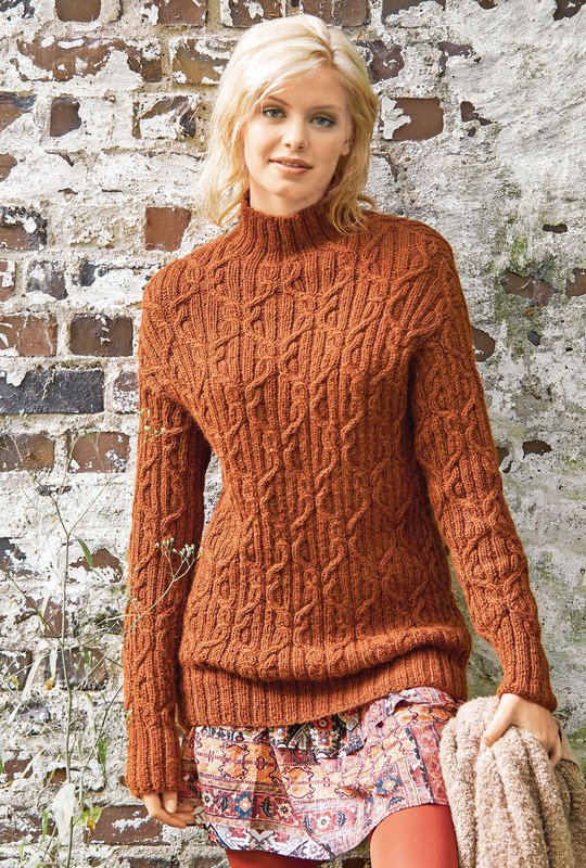 Viel Struktur bietet der schmal geschnittene Longpulli durch das ausdrucksstarke Muster, dessen Fond aus markanten Rippenstrukturen besteht, die allover miteinader verkreuzt sind. Mit seinem typischen Zopfmuster, die alle im Aranstil gestrickten Pullover aufweisen, ist der nussbraune Pullover aus feiner Alpakawolle genau richtig, um ihn im Herbst als Jackenersatz oder im Winter bei einem Spaziergang im Schnee zu tragen. Die lange Form sieht nicht nur toll aus zu einem gemusterten Minirock, sie schmeichelt der Figur auch über schmalen Jeans. Den Pulli in bequemer Weite kannst du für Größe 36/38 und 44/46 stricken.