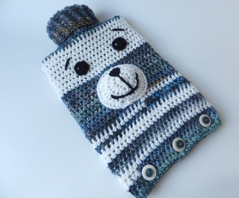 Außerdem lädt dieser Bezug zum kuscheln ein. Mit diesem Bezug kann die Wärmflasche bequem von oben gefüllt werden. Im unteren Bereich sind drei Knöpfe angebracht, somit kann der Bezug problemlos ausgezogen und gewaschen werden.