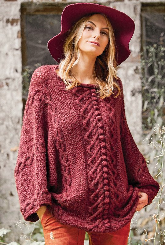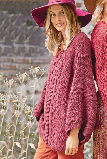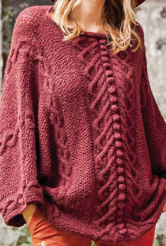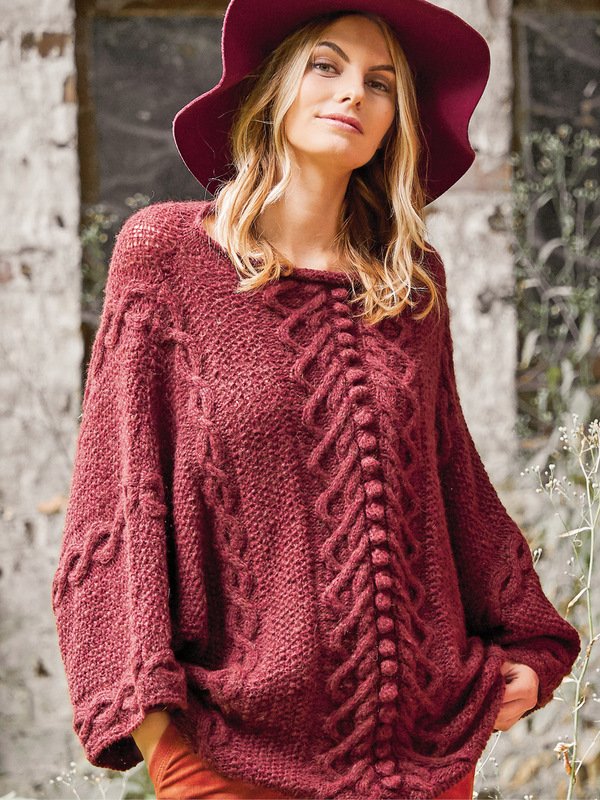 Perlstrukturen, Zöpfe und Noppen bilden den spannenden Mustermix dieses bordeauxroten Ponchopullis, dessen Dreiviertel-Ärmel gleich mit angestrickt werden. Ob als Jackenersatz einfach zum Drüberziehen, wenn es etwas kühler wird, oder als eigenständiger Pullover, der Poncho-artige Pullover macht alles mit. Das kräftiges Bordeauxrot bringt die dreidimensionale Struktur des Strickmusters, bestehend aus kleinem Perlmuster, verschlungenen Zöpfen und dicken Noppen besonders zur Geltung. Ein weiteres hübsches Detail ist der am U-Boot-Ausschnitt angestrickte schmale Rollrand in glatt rechts. Der Ponchopulli passt von Größe 38 – 42.