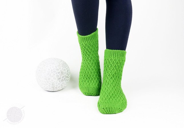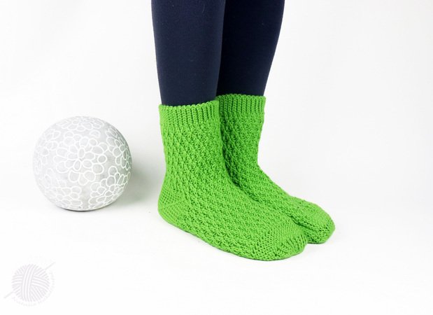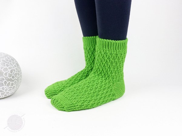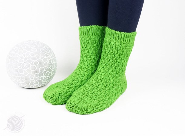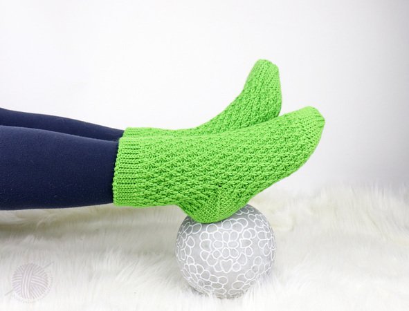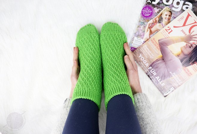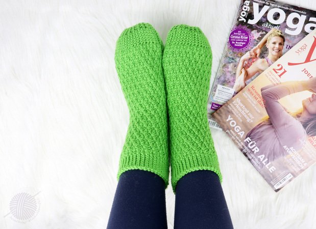 Warme Haussocken im Stricklook häkeln, ist mit dieser Anleitung überhaupt kein Problem! Ein senkrechtes Muster im Stricklook, leicht anpassbare Größe machen diese Söckchen zu einem echten Hingucker! Die Socken werden als ein Teil um den Fuß herum, senkrecht, gehäkelt (als ob man ein Blatt Papier um den Fuß herum wickelt). Dabei wird die Ferse am Ende an die Socke angehäkelt. Es entsteht eine Nahtlinie auf der Innenseite der Socke, die sehr platt ist und gar nicht beim Laufen stört. Das Zusammennähen der Socken wird ebenfalls in der Anleitung erklärt.