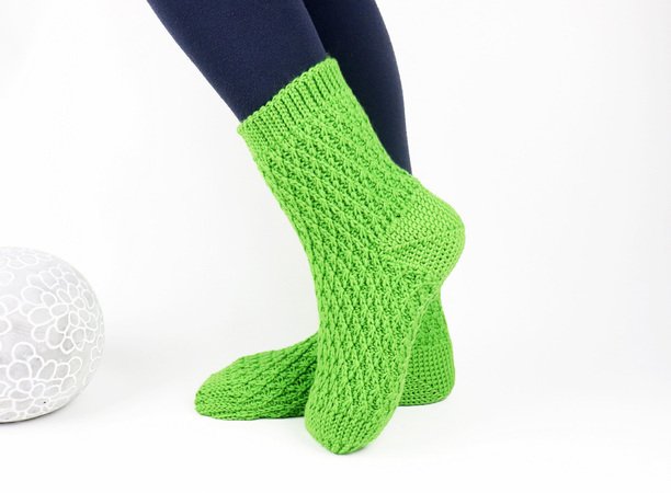 Diese Socken dehnen sich sehr gut in die Breite und passen für den Fußumfang von 25 bis 30 cm.