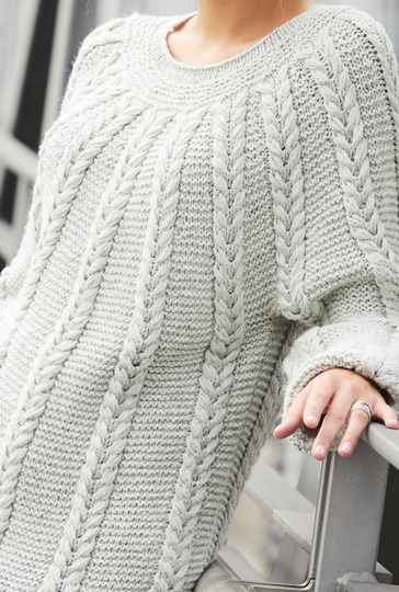 Die Zopfstreifen des mintgrünen Sweaters treten durch das voluminöse Baumwoll-Alpaka-Garn eindrucksvoll in den Vordergrund und setzen sich auf Brusthöhe als Rundpasse fort. Das kuschelweiche,fedrig leichte Garn hat einen interessanten Melange-Effekt und gleitet super über die Nadeln. Bis zum Beginn der tiefen Rundpasse, werden Vorder- und Rückteil sowie die Ärmel separat gestrickt, dann auf einer Rundstricknadel in Runden weitergearbeitet; es gibt also nicht viele Nähte zum Zusammennähen. Die Zöpfe aus langgezogenen Maschen werden durch Kraus-rechts-Streifen voneinander getrennt. Das Ende der Passe bildet eine kraus-rechts und glatt rechts gestrickte Blende. Anleitung in Größe 38/40.