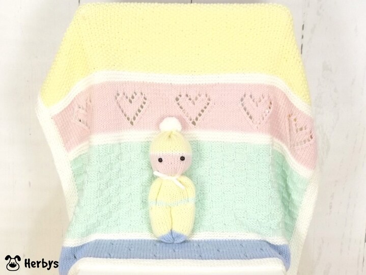 4 verschiedene Muster in 4 verschiedenen Farben und mit der restlichen Wolle geht sich noch ein süßes Schlafpüppchen aus!