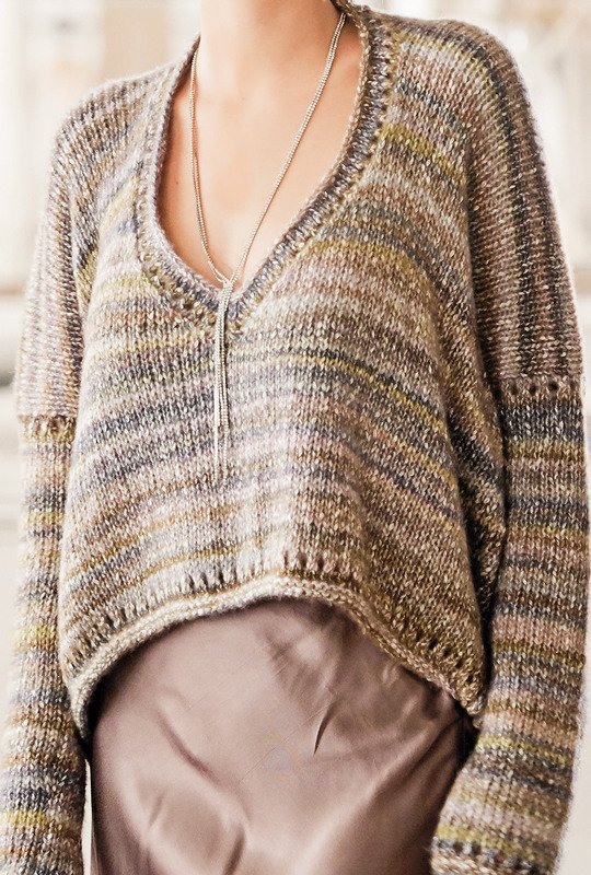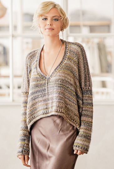 Oversize-Pullis mit überschnittenen Schultern und schmalen Ärmeln gehören zu den Top-Favoriten in dieser Saison. Hier beeindruckt vor allem das Farbverlaufsgarn, das sich durch funkelnde Lurexfasern hervorhebt. Durchaus nicht nur für die Ausgehgarderobe gedacht, sondern ebenso gut über einem schmalen Rock oder einer Slimfit-Jeans attraktiv. Glatt rechts gestrickt mit dekorativen Lochstreifen an Saum- und Ärmelrändern und rund um den großzügigen V-Ausschnitt. Die Anleitung steht in den Größen 38 – 42 und 44 – 48 zur Verfügung.