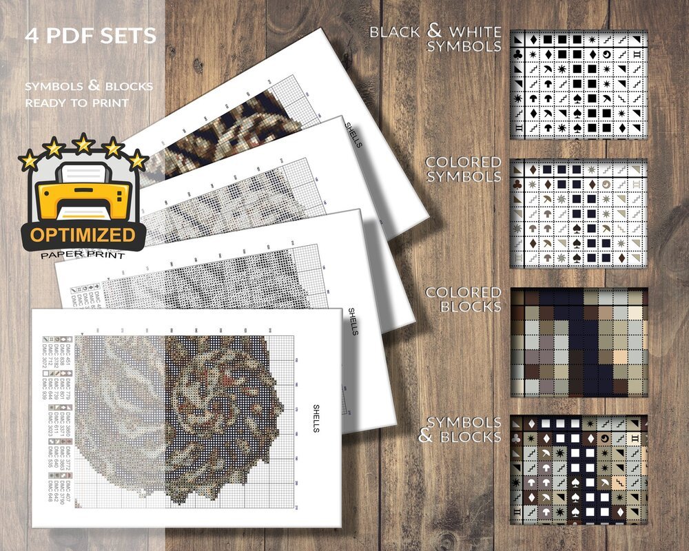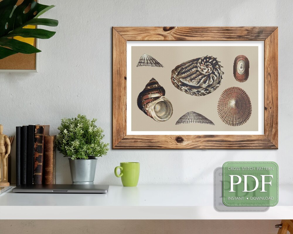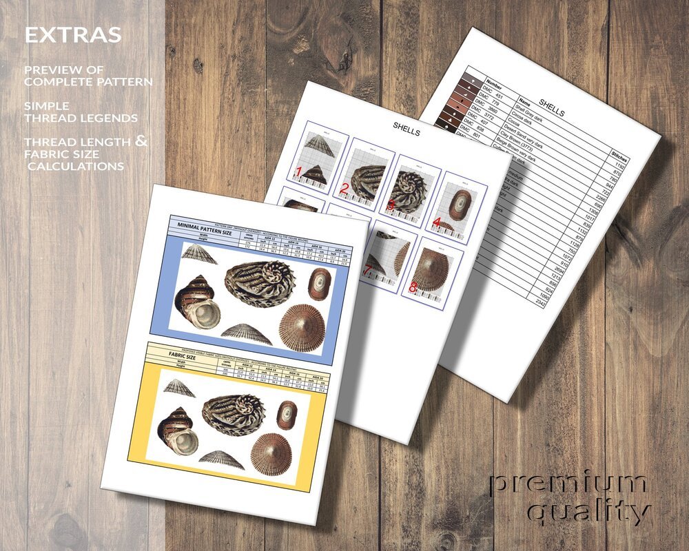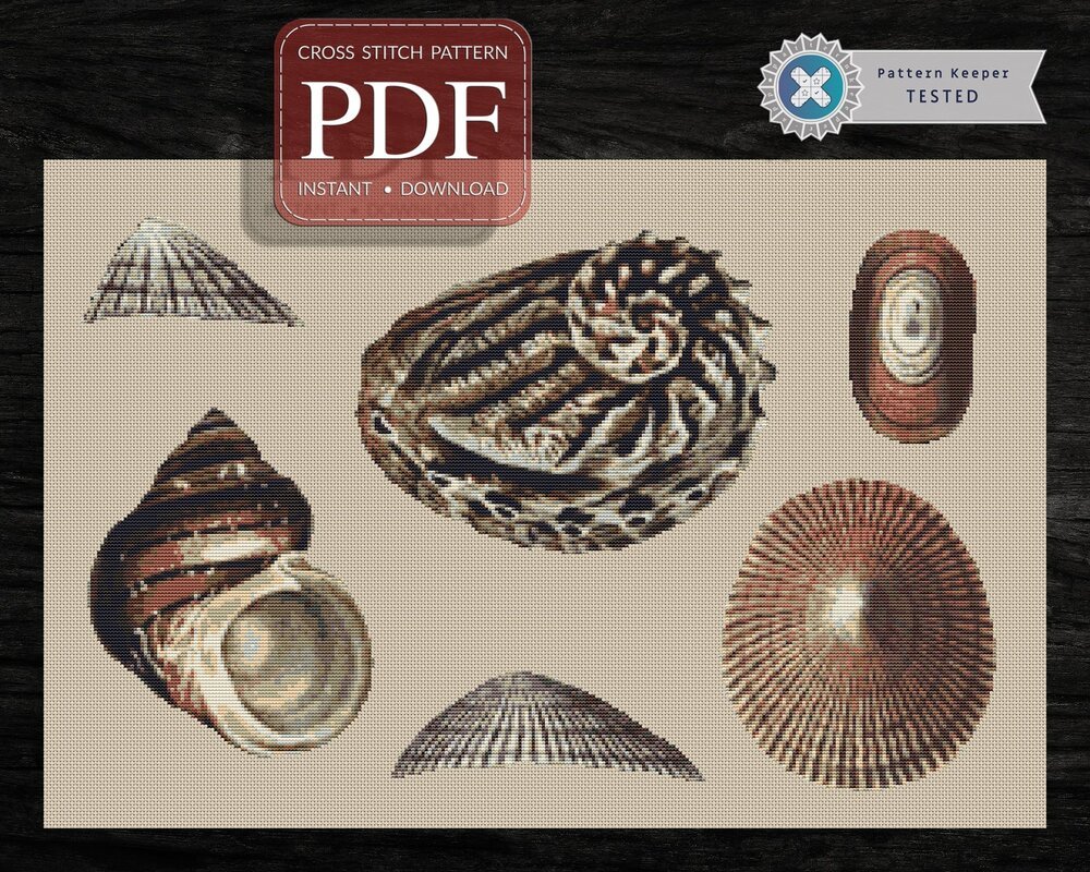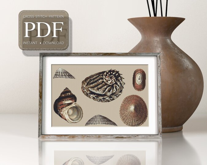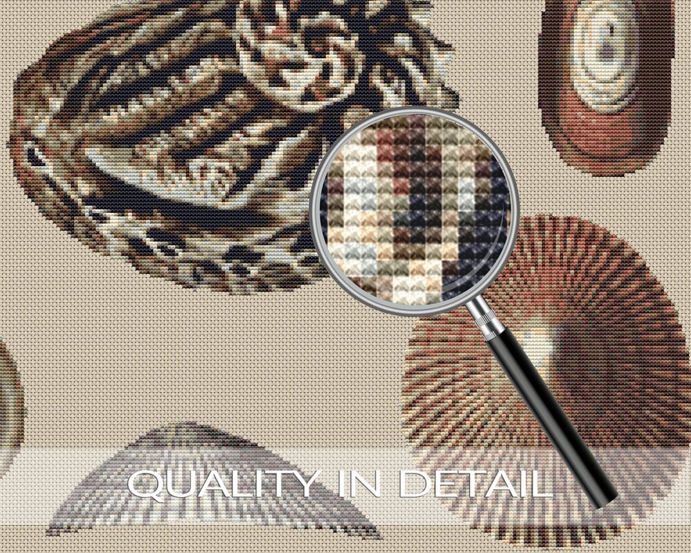 A cross stitch pattern with great detail and love for realistic shading and coloring: these shells evoke distance, sea, vacation and adventure.