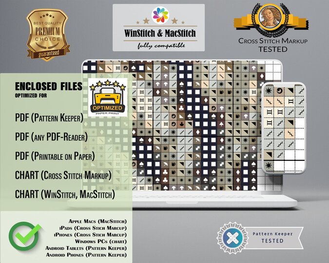 You will receive the cross stitch pattern as PDF files, available for instant download. The digital files are optimized for printing an paper or fore use on the screens of tablets, mobile phones or laptops (well tested for Pattern Keeper, WinStitch, etc.). You can buy these files right here and download them immediately.