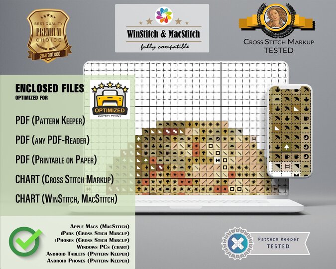You will receive the cross stitch pattern as PDF files, available for instant download. The digital files are optimized for printing an paper or fore use on the screens of tablets, mobile phones or laptops (well tested for Pattern Keeper, WinStitch, etc.). You can buy these files right here and download them immediately.