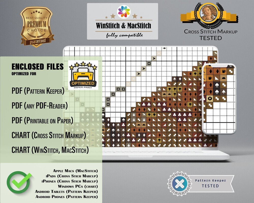You will receive the cross stitch pattern as PDF files, available for instant download. The digital files are optimized for printing an paper or fore use on the screens of tablets, mobile phones or laptops (well tested for Pattern Keeper, WinStitch, etc.). You can buy these files right here and download them immediately.