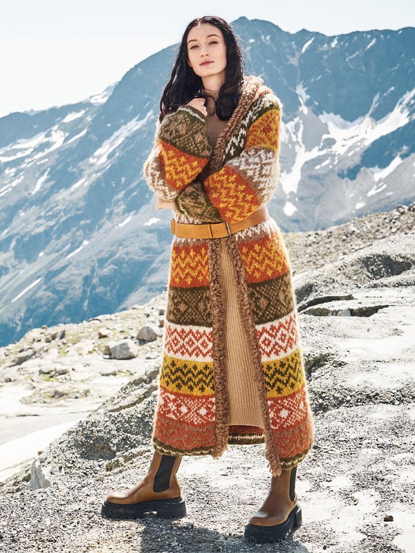 Unser Mantel wird ganz klassisch in fünf Teilen gestrickt, mit Nadelstärke 7 geht es dabei auch recht gut voran. Die drei verwendeten Jacquardmuster sind interessant zu stricken, aber nicht zu aufwändig und die übersichtliche Strickschrift hilft dabei, stets die Übersicht zu behalten. Sind alle fünf Teile fertig , werden die Schulternähte geschlossen und aus dem Halsausschnitt die Kapuze herausgestrickt. Danach alle Kanten in Camel mit Schlingen umhäkeln und die restlichen Nähte schließen.