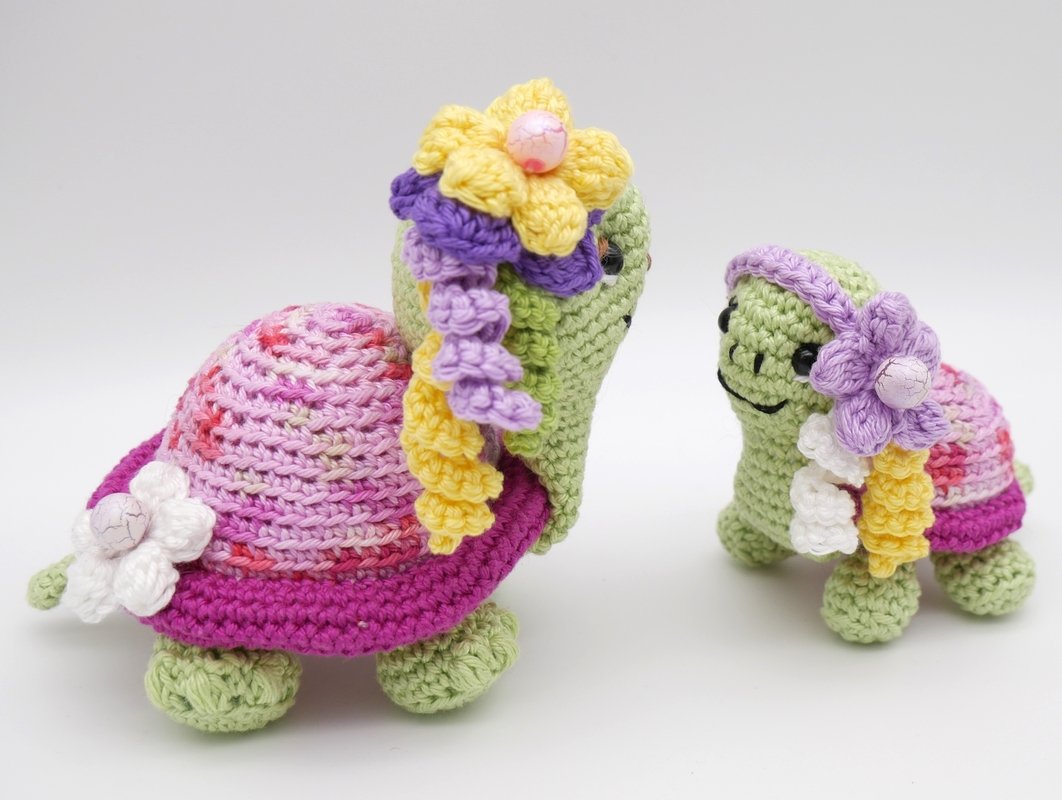 Mit dieser Häkelanleitung erhältst du 2 Schildkröten in verschiedenen Größen, inklusive Stirnband und Blumenschmuck.