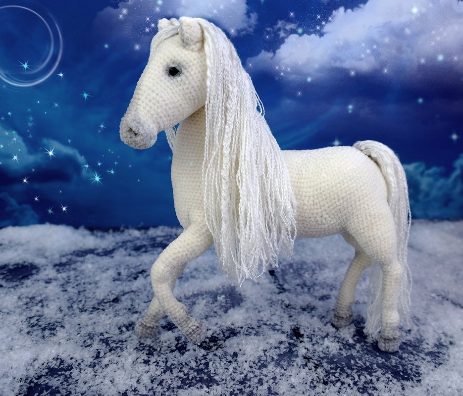 Das weiße Pferd ist aus weicher Chenille Wolle gehäkelt. Das Drahtgerippe im Inneren des Pferdes ermöglicht es , dass das Pferd alleine steht und auch seinen Kopf und Beine in alle Richtungen bewegen kann. Für kleinere Kinder kann man das Pferd ohne Draht und Wimpern machen.