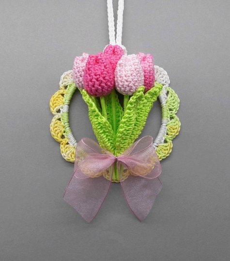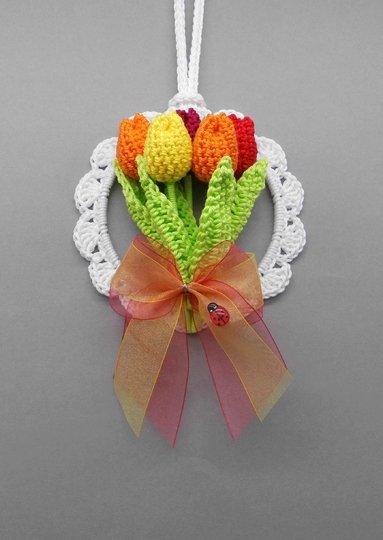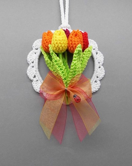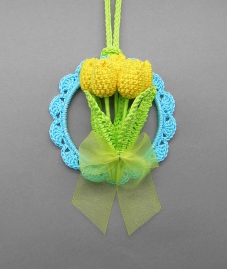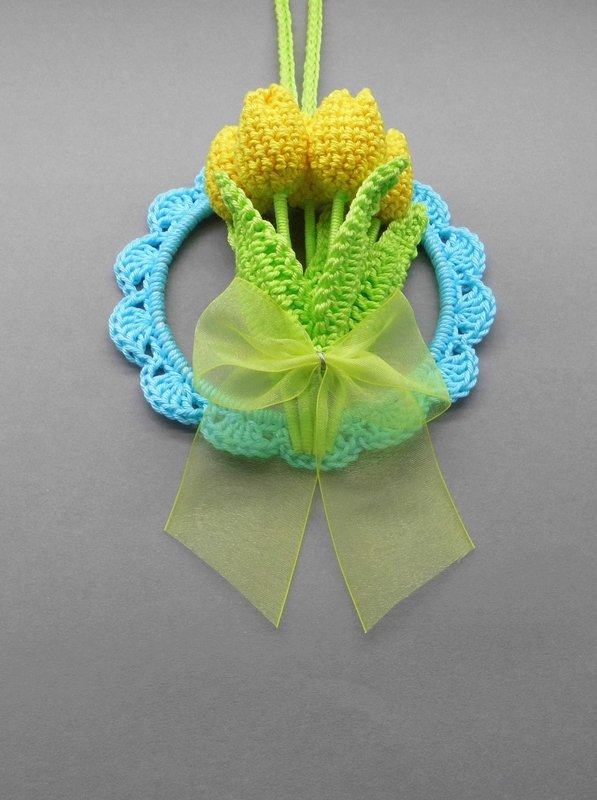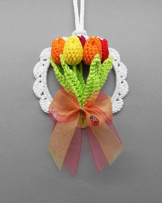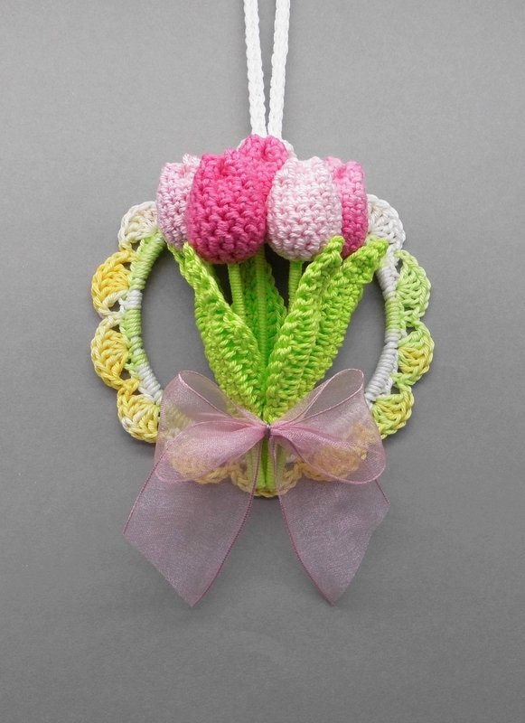 Der Dekohänger kleiner Tulpengruß lässt sich, auch von Anfängern mit etwas Übung, ganz einfach in Deinen Wunschfarben aus Wollresten häkeln.