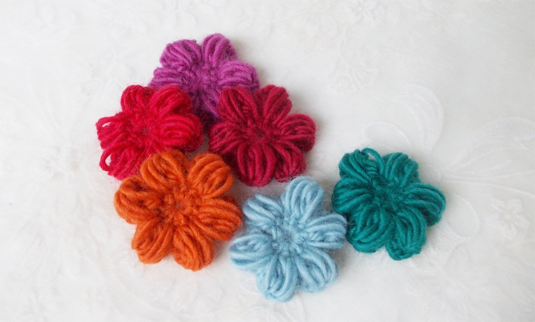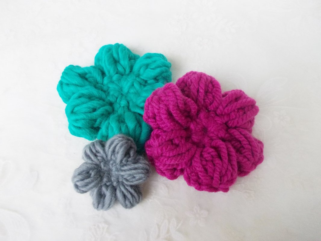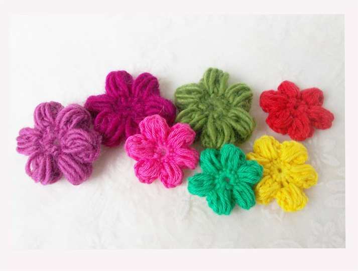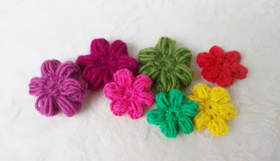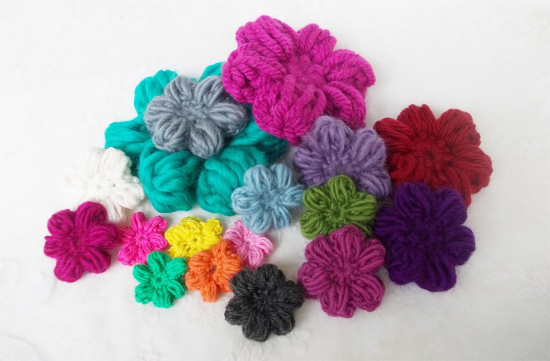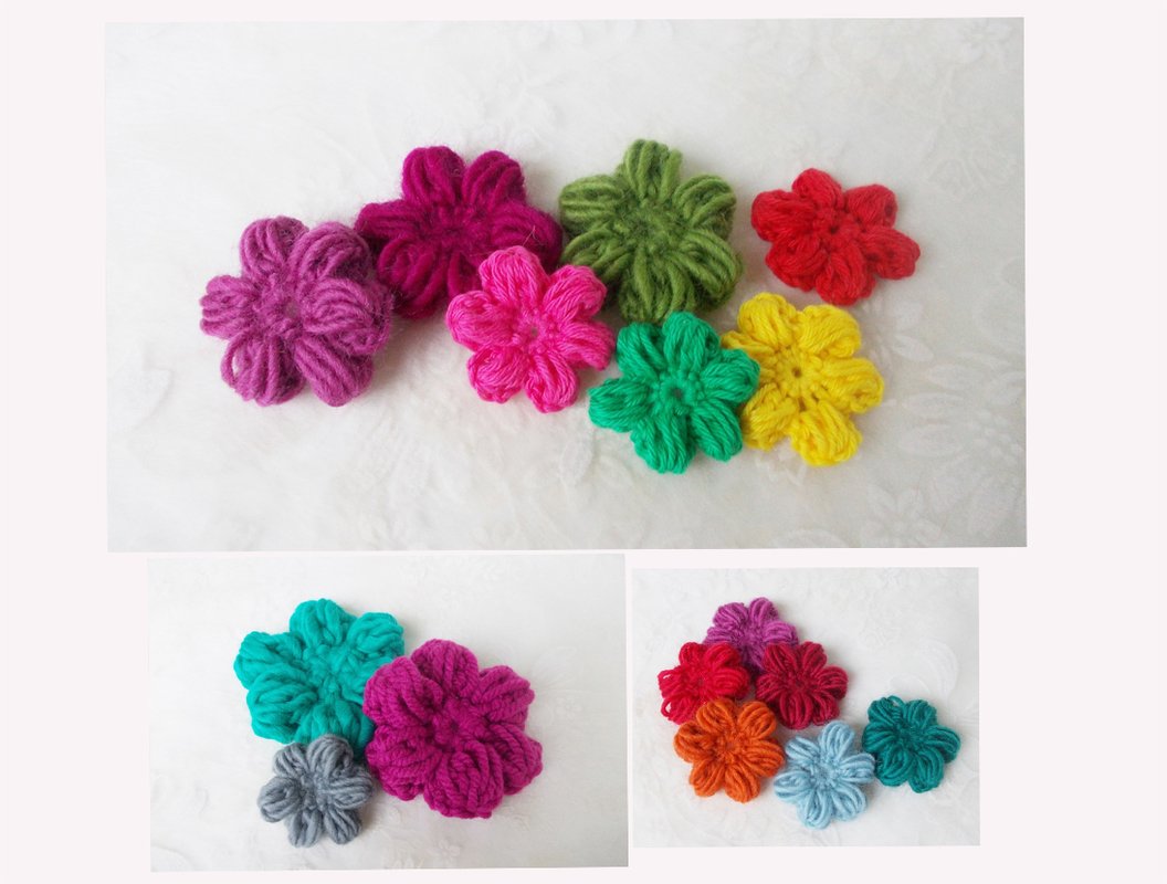 Es werden Luftmaschen, Kettmaschen, feste Maschen und Schlingen gehäkelt. Ich liebe meine kleinen Pufferchen und verkaufe diese auch einzeln schon seit einigen Jahren. Besonders klasse sind die Blumen, wenn man richtig dicke Wolle nimmt.