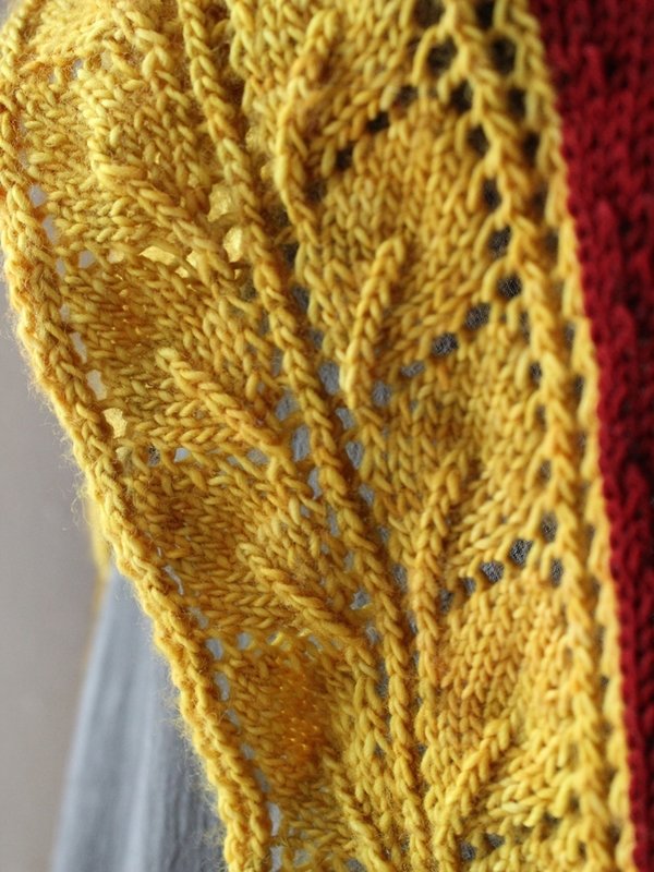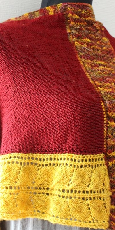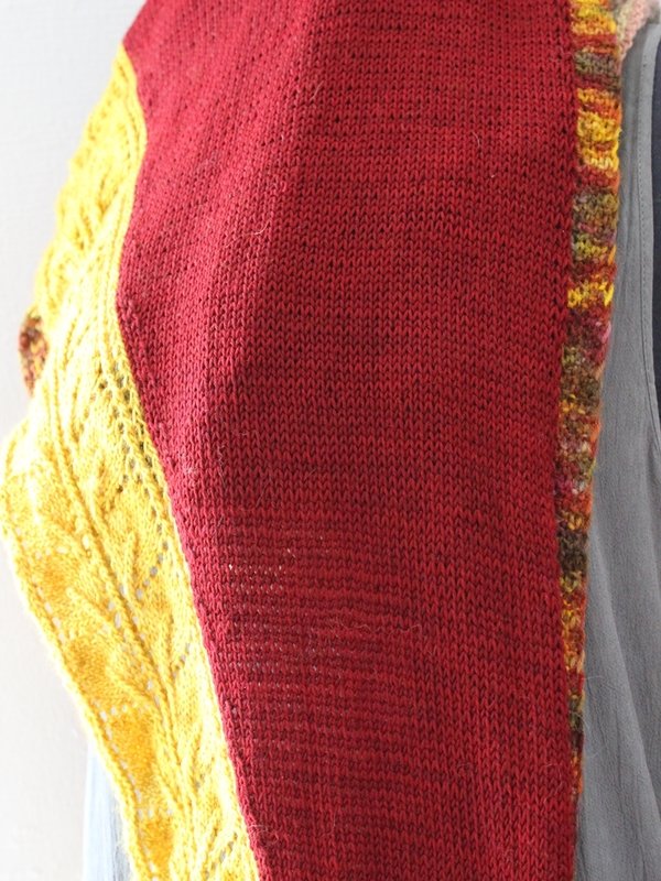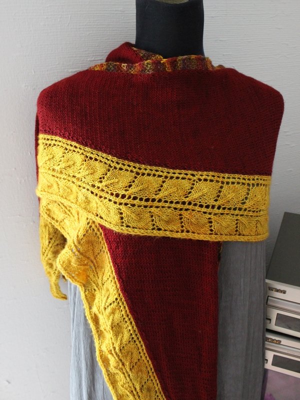 Ein Tuch, in den Farben des Herbstes, gestrickt in drei Teilen. Schön groß und kuschlig, dabei nur 233 gr. schwer. Ich habe dieses Tuch mit Wollmeise Pure, Madelinetosh und einem handgefärbten Sockengarn gestrickt. Es kann aber auch mit jeder anderen Wolle gestrickt werden. Die Testrickerin hat Wolle von Lang verwendet. Eine Maschenprobe ist nicht erfoderlich.