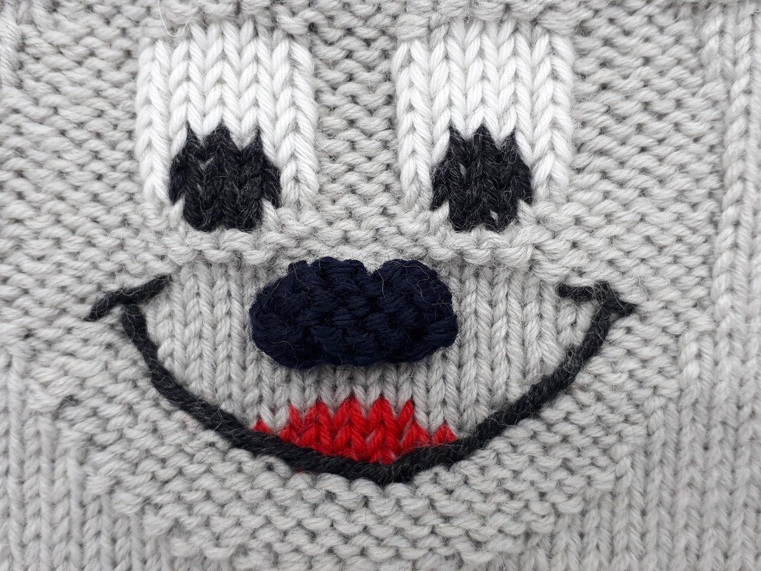 Die Nase wird mitgestrickt. Das Gesicht wird aufgestickt, Beispielfotos sind in der Anleitung enthalten, ein Stickkurs nicht! Maschenstich und Stielstich solltest du beherrschen.