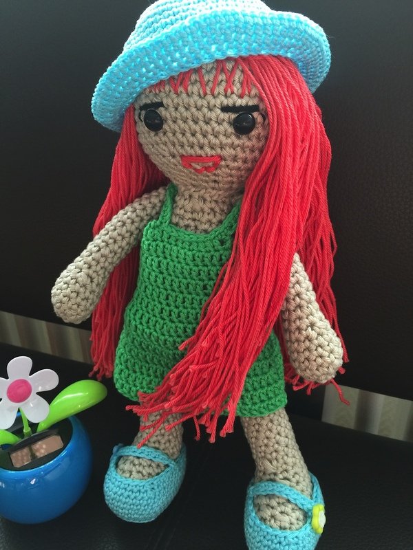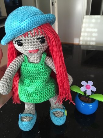 Diese Puppe ist ca. 28 cm groß, wenn man Wolle von Catania Grande für den Grundkörper benutzt mit einer Häkelnade der Stärke 4.
